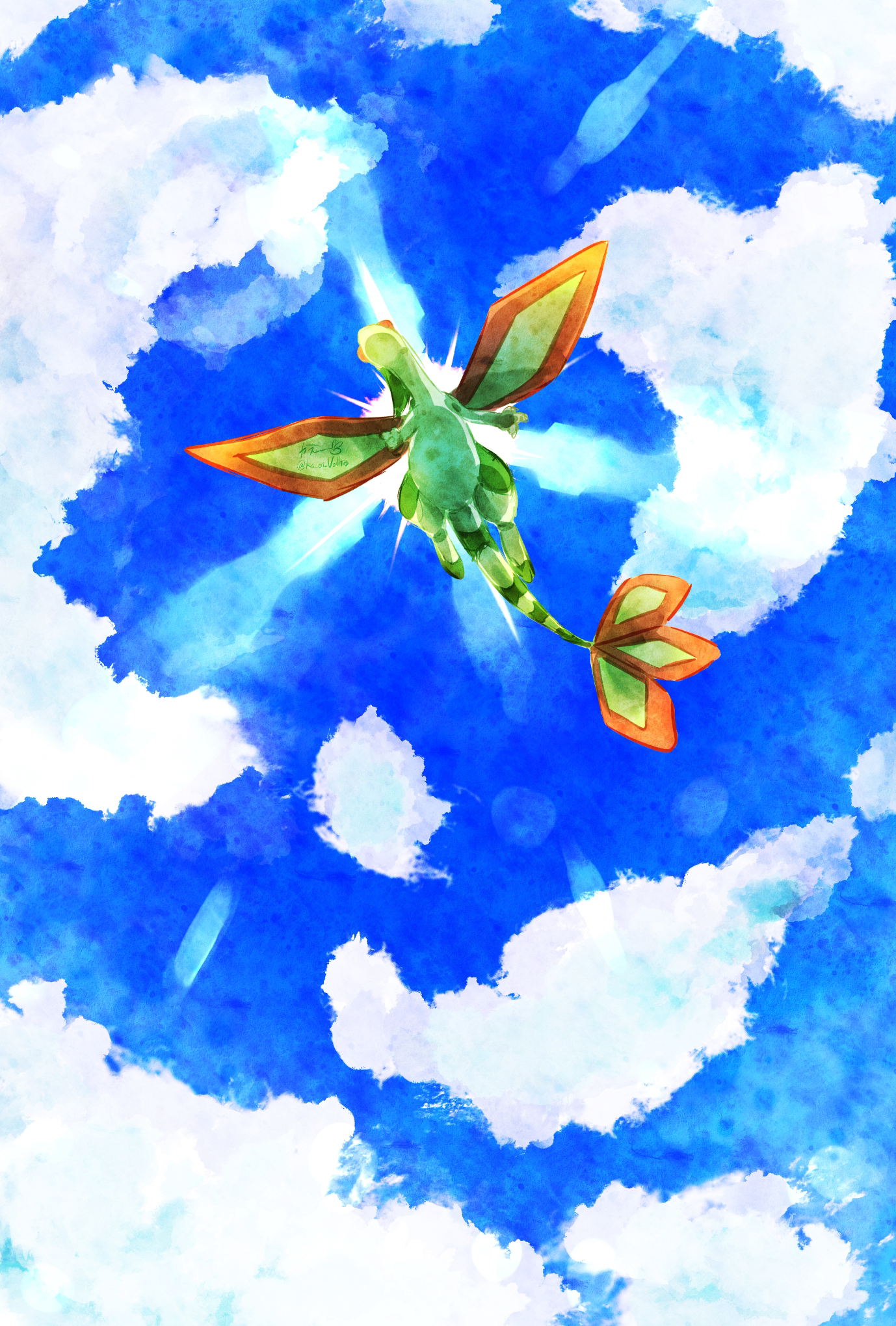 animal_focus artist_name blue_background blue_sky blue_theme cloud day dragon flygon flying from_below full_body gen_3_pokemon highres ka_ei_volltis lens_flare nintendo no_humans outdoors pokemon pokemon_(creature) signature sky solo sunlight twitter_username