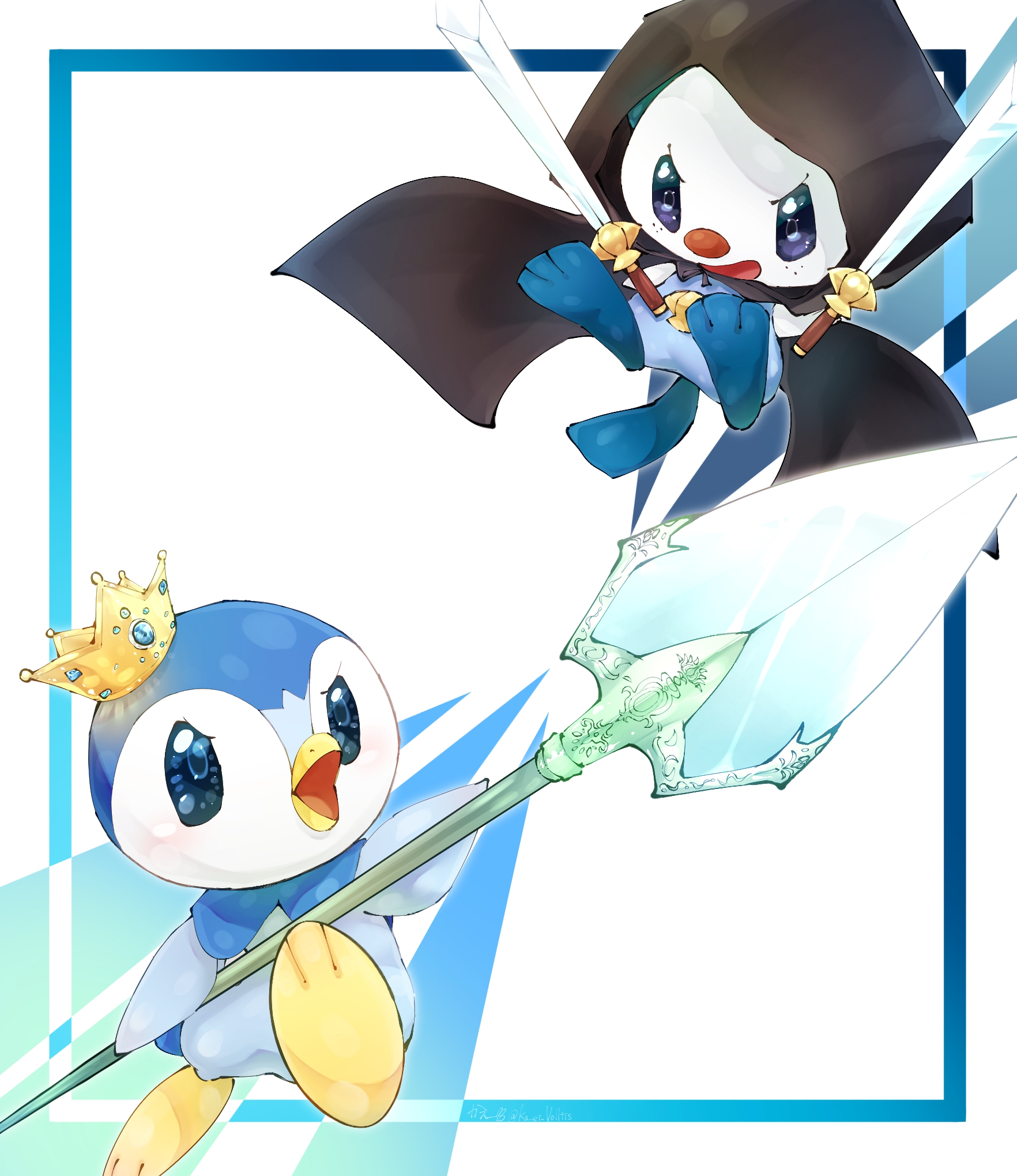 animal_focus black_cape blue_border blue_eyes blue_gem blue_sclera border cape clothed_pokemon colored_sclera crown dual_wielding eye_contact fight freckles full_body gem gen_4_pokemon gen_5_pokemon highres holding holding_polearm holding_sword holding_weapon hood hood_up hooded_cape jumping ka_ei_volltis looking_at_another mini_crown nintendo no_humans open_mouth oshawott piplup pokemon pokemon_(creature) polearm seashell shell simple_background spear sword tilted_headwear weapon white_background yellow_headwear