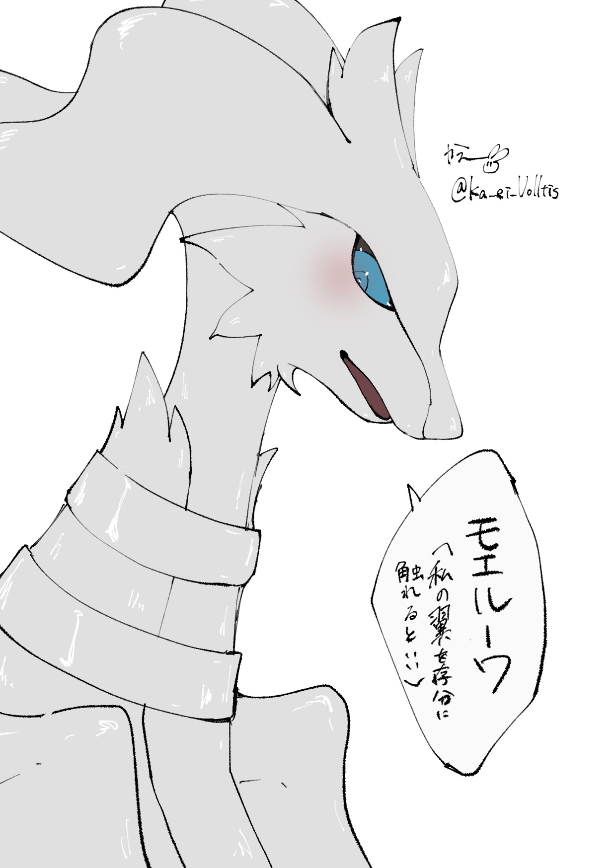 animal_focus artist_name averting_eyes black_sclera blue_eyes blush colored_sclera dragon flat_color from_side gen_5_pokemon highres japanese_text ka_ei_volltis legendary_pokemon looking_down looking_to_the_side nintendo no_humans open_mouth pokemon pokemon_(creature) profile reshiram signature simple_background sketch solo speech_bubble talking translation_request twitter_username white_background