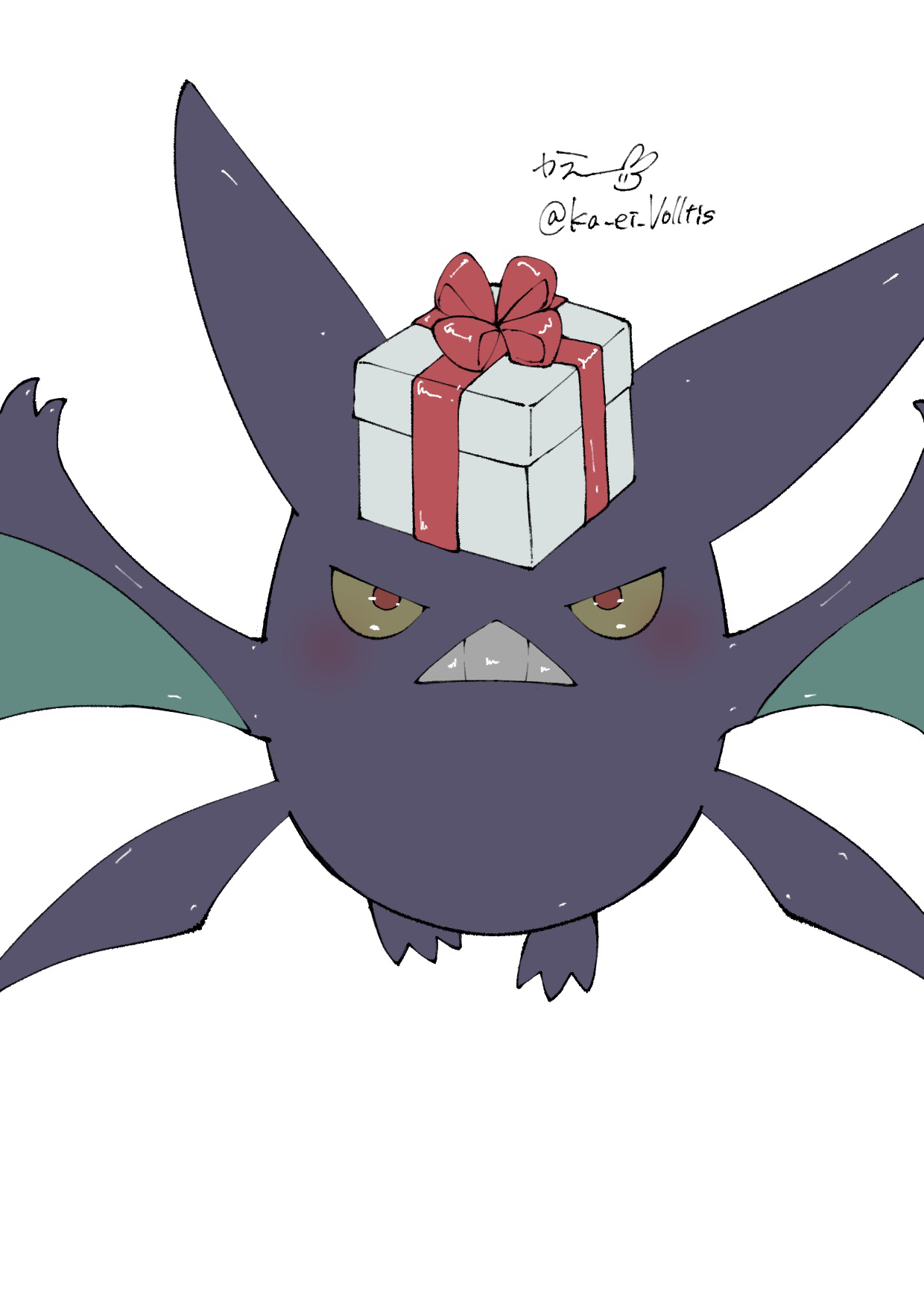animal_focus artist_name bat_(animal) blush box colored_sclera crobat flat_color gen_2_pokemon gift gift_box half-closed_eyes highres ka_ei_volltis looking_at_viewer nintendo no_humans object_on_head pokemon pokemon_(creature) red_eyes red_ribbon ribbon signature simple_background sketch solo straight-on teeth twitter_username white_background yellow_sclera