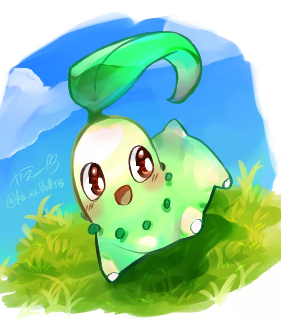 animal_focus artist_name blue_sky blush border bright_pupils chikorita cloud day full_body gen_2_pokemon grass happy jumping ka_ei_volltis leaf looking_to_the_side nintendo no_humans open_mouth outdoors pokemon pokemon_(creature) red_eyes signature sketch sky smile solo twitter_username white_border white_pupils