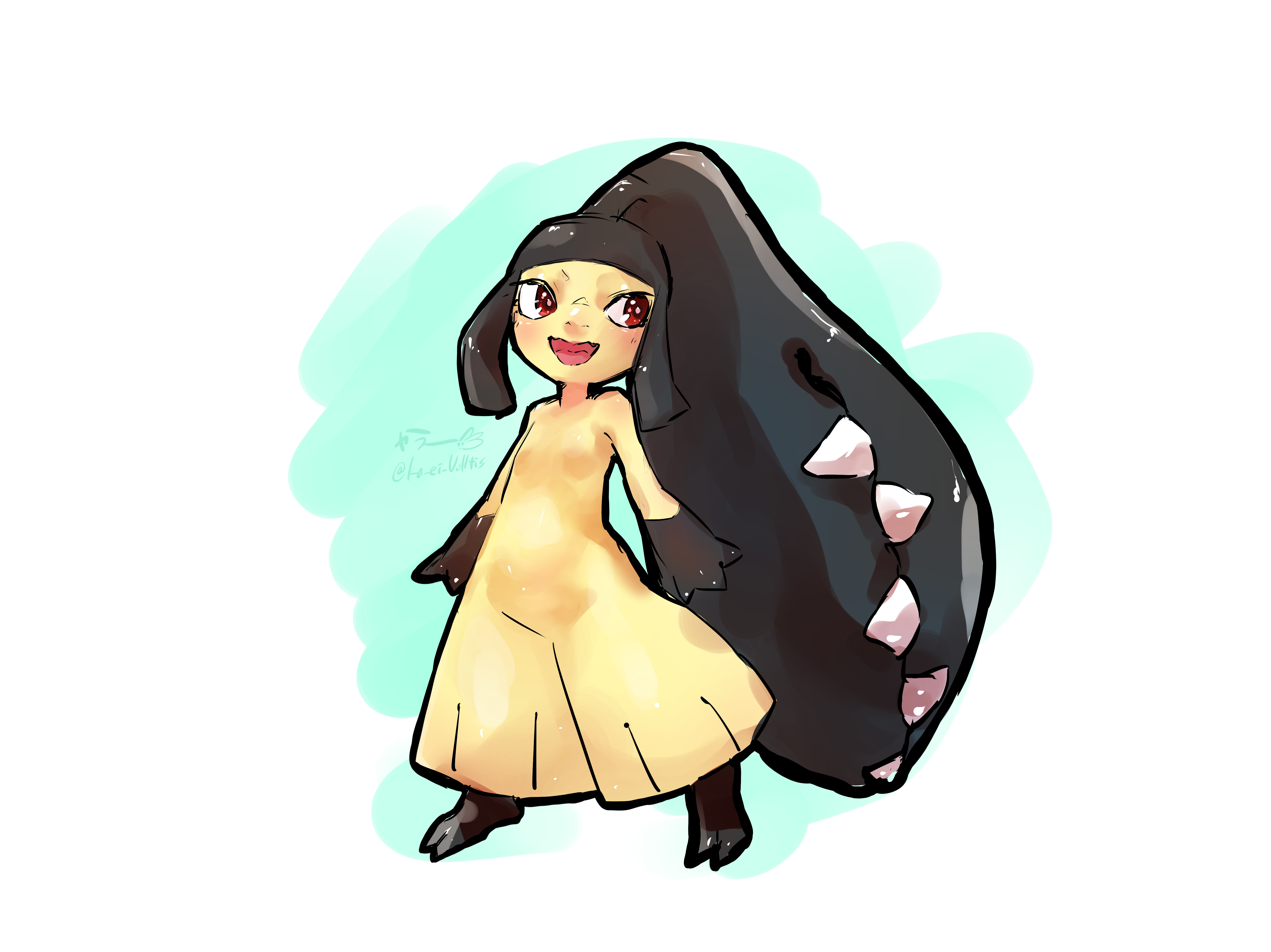 1girl :3 absurdres artist_name black_hair black_skin blunt_bangs blush closed_mouth colored_skin extra_mouth female_focus flat_chest full_body gen_3_pokemon happy highres ka_ei_volltis light_blush looking_to_the_side mawile multicolored_skin nintendo open_mouth pokemon pokemon_(creature) red_eyes sharp_teeth sidelocks signature simple_background sketch smile solo standing teeth two-tone_background two-tone_skin white_background yellow_skin