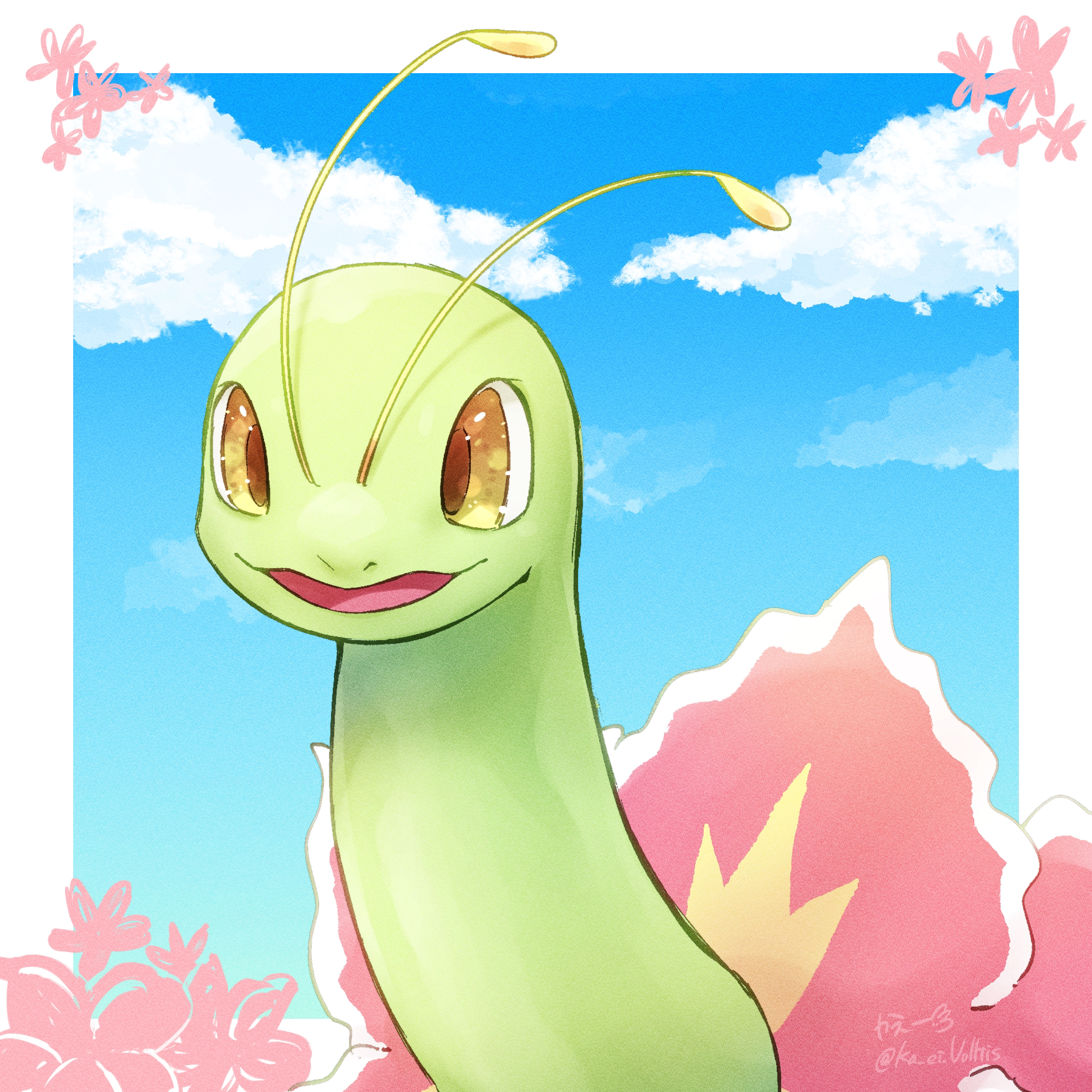 :3 animal_focus antennae artist_name blue_sky border cloud day gen_2_pokemon happy highres ka_ei_volltis looking_at_viewer meganium nintendo no_humans open_mouth outdoors outside_border pokemon pokemon_(creature) signature sky smile solo twitter_username upper_body white_border yellow_eyes