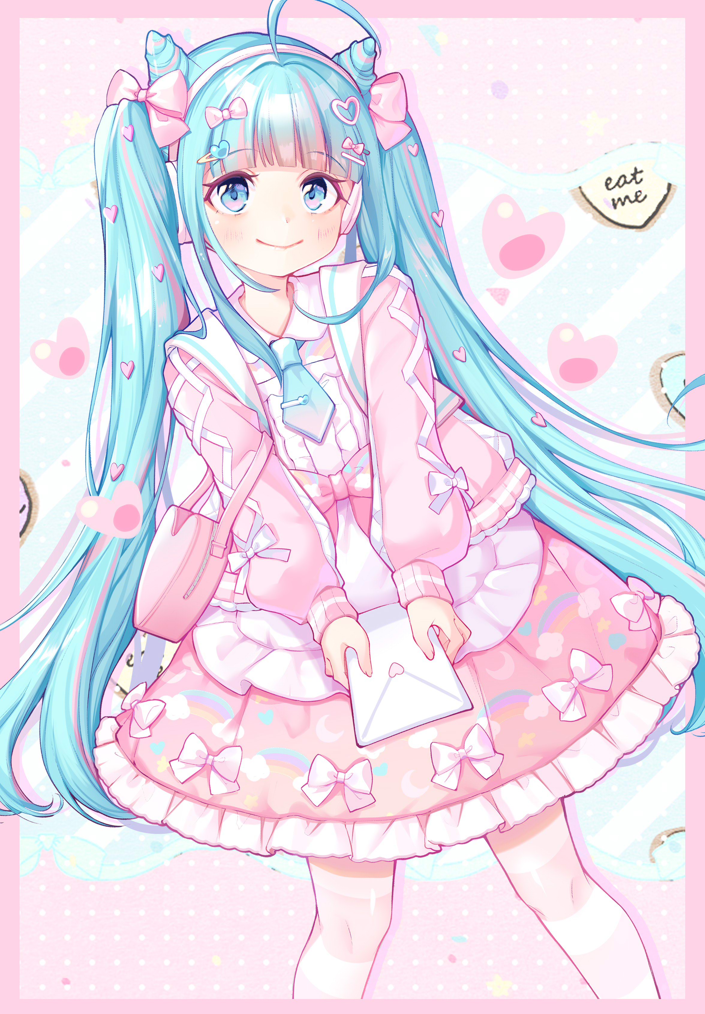 1girl absurdres bag blue_eyes blue_hair border bow cardigan closed_mouth collared_dress cone_hair_bun crbbie digital_stars_miku digital_stars_miku_(2021) double_bun dress english_text envelope frilled_dress frills hair_bow hair_bun hair_ornament hatsune_miku headband headphones highres holding holding_envelope jacket knees_together_feet_apart long_hair long_sleeves looking_at_viewer multicolored_hair necktie patterned_clothing pink_hair ribbon smile solo twintails two-tone_hair very_long_hair vocaloid yume_kawaii
