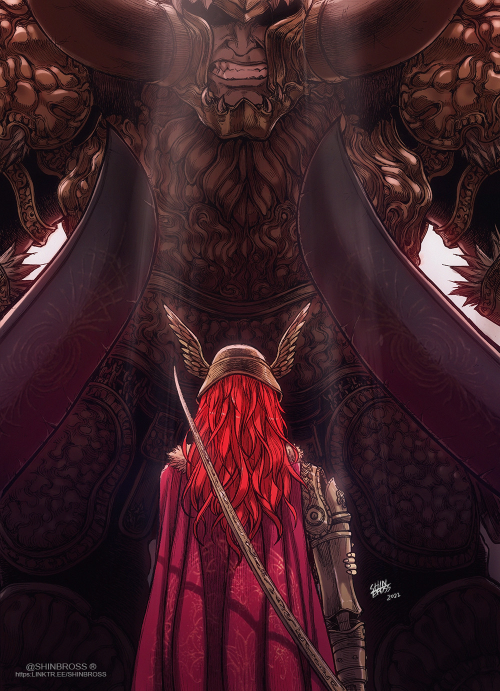 1boy 1girl armor artist_name blade cape clenched_teeth dual_wielding elden_ring fake_horns from_behind giant giant_male gold_armor height_difference helmet highres holding hand_on_own_arm horned_helmet horns huge_weapon katana malenia_blade_of_miquella prosthesis prosthetic_arm red_cape red_hair shinbross standing starscourge_radahn sword teeth valkyrie weapon winged_helmet