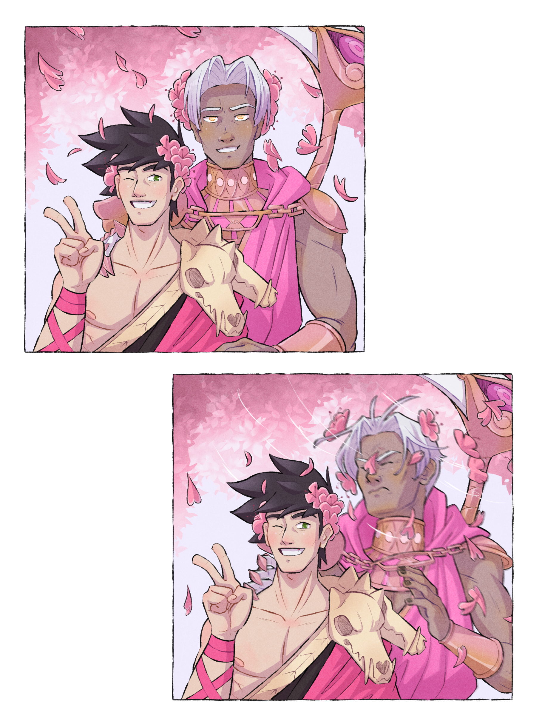 2boys absurdres alternate_color ancient_greek_clothes black_hair black_nails cherry_blossoms closed_eyes dark-skinned_male dark_skin gorget greco-roman_clothes green_eyes hades_(series) hades_1 highres jamie_loughran male_focus multiple_boys nail_polish one_eye_closed petals single_bare_shoulder skull smile thanatos_(hades) upper_body v white_hair yellow_eyes zagreus_(hades)