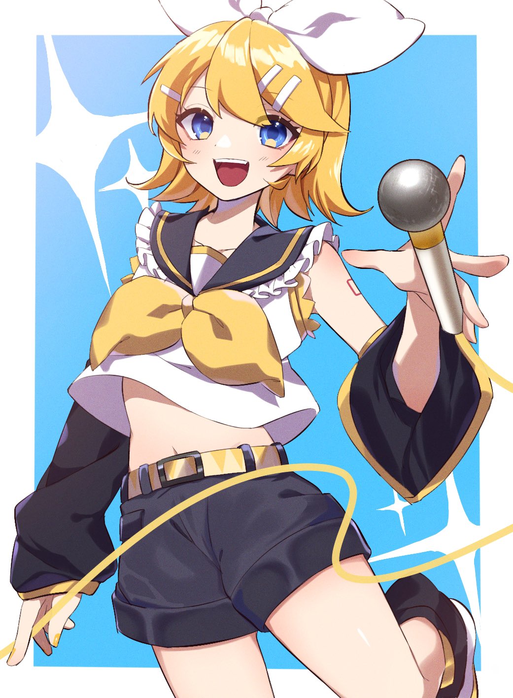 1girl blonde_hair blue_eyes bow bow_hairband hairband highres kagamine_rin looking_at_viewer open_mouth short_hair smile solo soramame_pikuto vocaloid