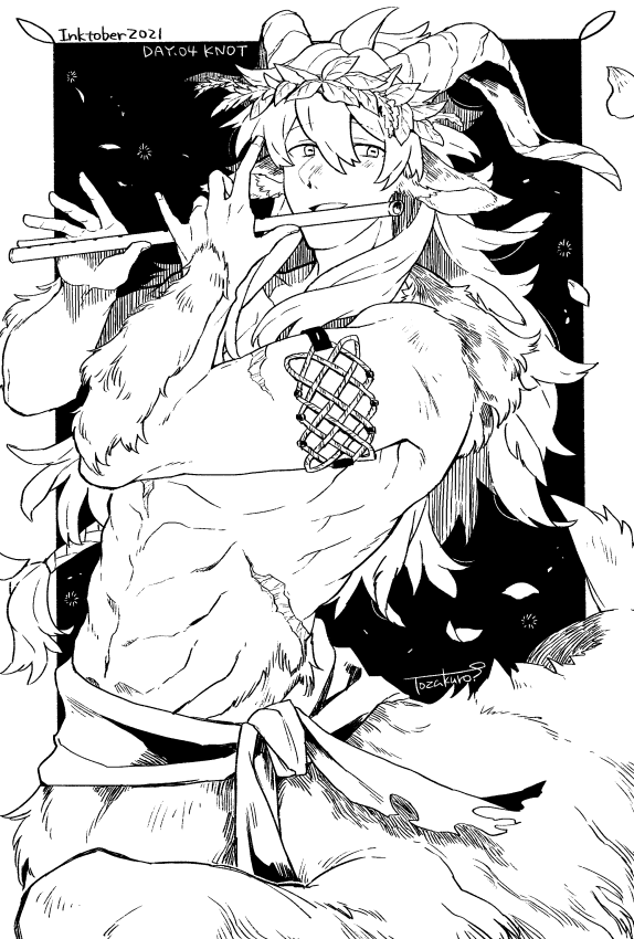 1boy 2021 animal_ears arm_garter arms_up black_background centauroid feet_out_of_frame flute goat_boy goat_ears goat_horns greyscale hair_between_eyes hair_ornament holding holding_instrument horizontal_pupils horns inktober instrument leaf_hair_ornament long_hair looking_to_the_side male_focus monochrome monster_boy music original petals playing_flute playing_instrument sash scar scar_on_arm scar_on_stomach signature smile solo taur toned toned_male tozakuro_s transverse_flute white_background