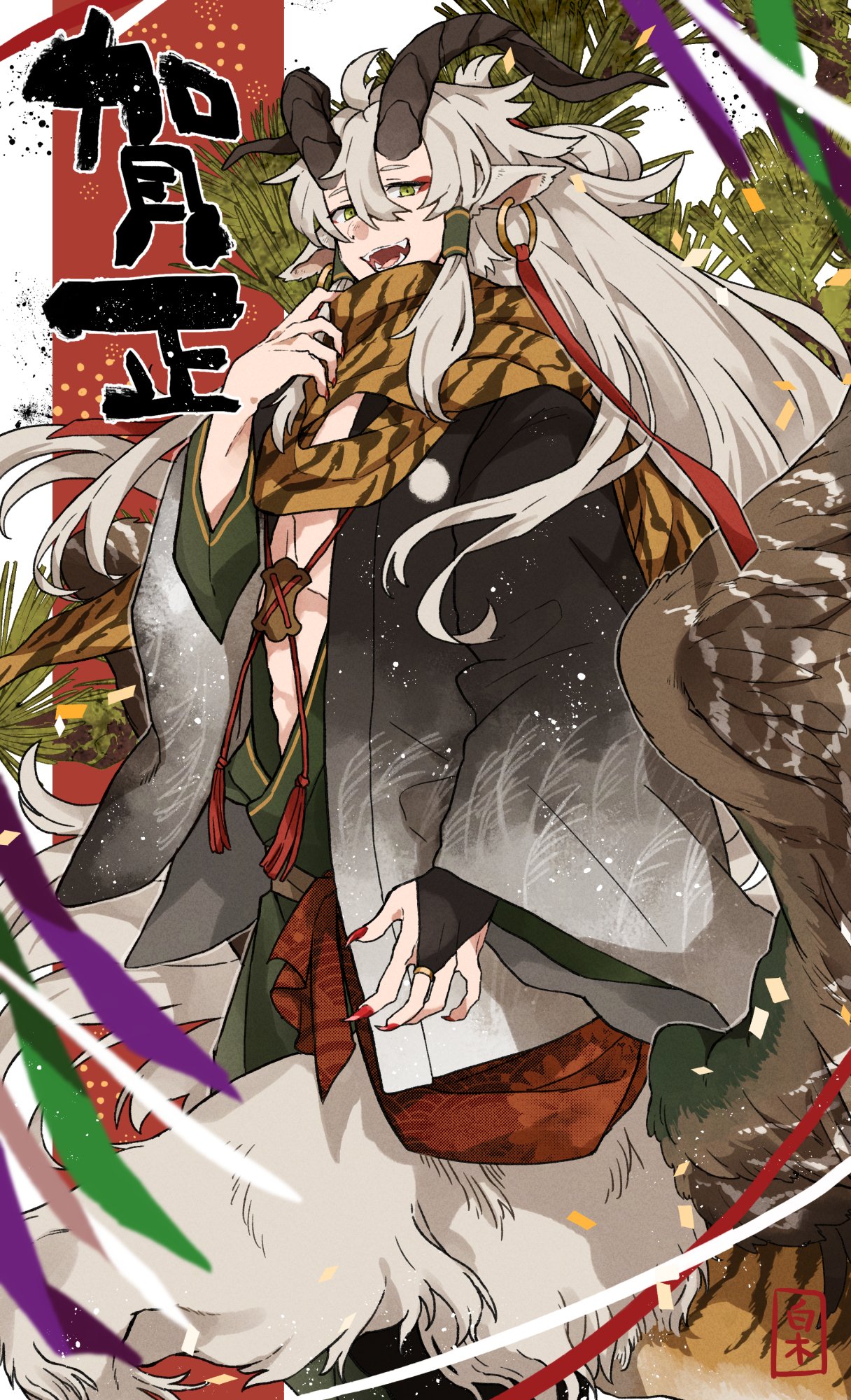 1boy animal_ears bird_wings brown_horns brown_scarf centauroid chimera ear_piercing facial_mark fangs feathered_wings feathers fingernails goat_ears goat_horns green_eyes hair_between_eyes highres horns jewelry long_hair long_sleeves looking_at_viewer male_focus monster_boy multicolored_background nail_polish original piercing plant red_background red_nails ring scarf sharp_fingernails sidelocks signature snowing solo striped_clothes striped_scarf taur tozakuro_s translated upper_body very_long_hair white_background white_fur white_hair wide_sleeves wings