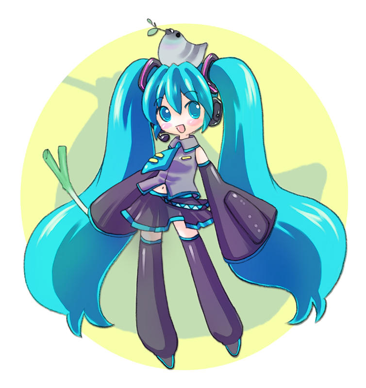 1girl absurdly_long_hair animal animal_on_head bird bird_on_head black_skirt black_sleeves black_thighhighs blue_eyes blue_hair blush breasts collared_shirt commentary_request dated_commentary detached_sleeves full_body grey_shirt hatsune_miku kawagoe_pochi long_hair looking_at_viewer midriff_peek miniskirt navel on_head open_mouth shirt skirt sleeveless sleeveless_shirt sleeves_past_fingers sleeves_past_wrists small_breasts smile solo spring_onion thighhighs twintails very_long_hair vocaloid