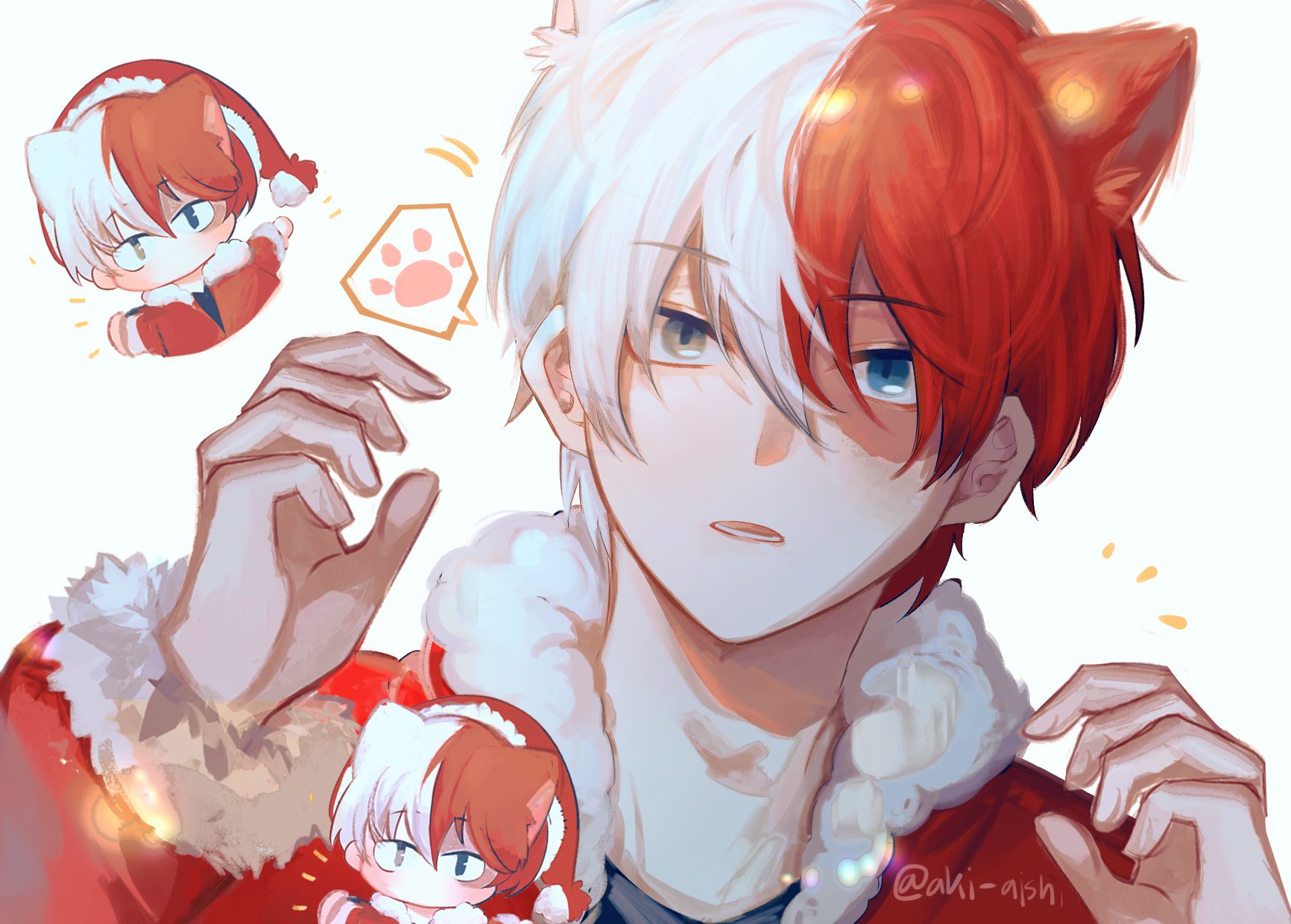 1boy akira_aishi animal_ears blue_eyes boku_no_hero_academia burn_scar cat_boy cat_ears chibi coat commentary_request fur-trimmed_coat fur_trim grey_eyes hair_between_eyes hands_up hat highres kemonomimi_mode looking_at_viewer male_focus multicolored_hair no_mouth open_mouth paw_print red_coat red_hair red_headwear santa_costume santa_hat scar scar_across_eye scar_on_face short_hair signature simple_background split-color_hair spoken_paw_print thai_commentary todoroki_shoto two-tone_hair white_background white_hair