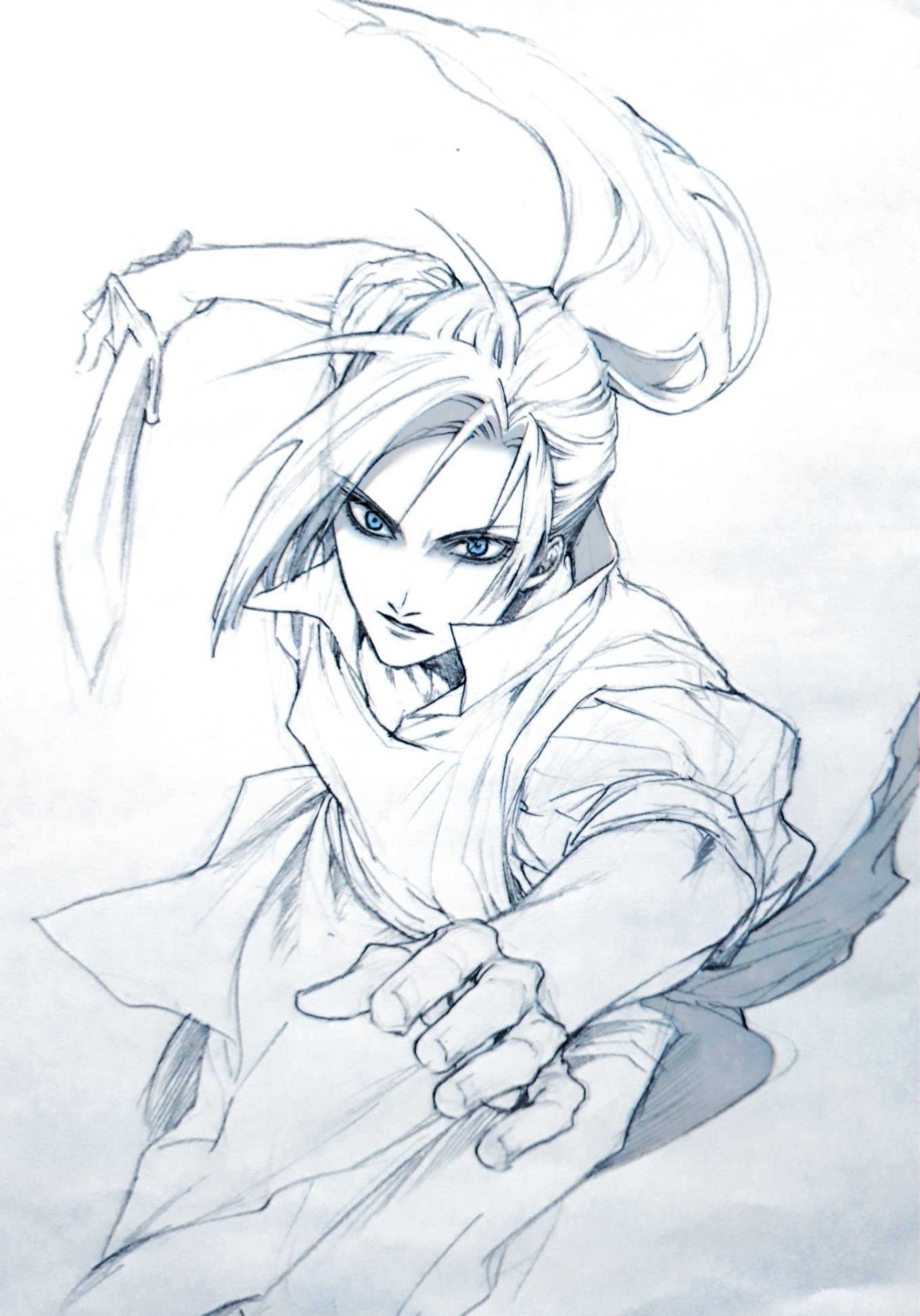 1boy aiming aiming_at_viewer arms_up arthur_beresford attack blue_eyes csanaca floating_hair higeki_no_genkyou_tonaru_saikyou_gedou_last_boss_joou_wa_tami_no_tame_ni_tsukushimasu highres holding holding_sword holding_weapon long_hair looking_at_viewer male_focus monochrome ponytail simple_background sleeves_pushed_up solo spot_color sword tunic twitter_username weapon white_background