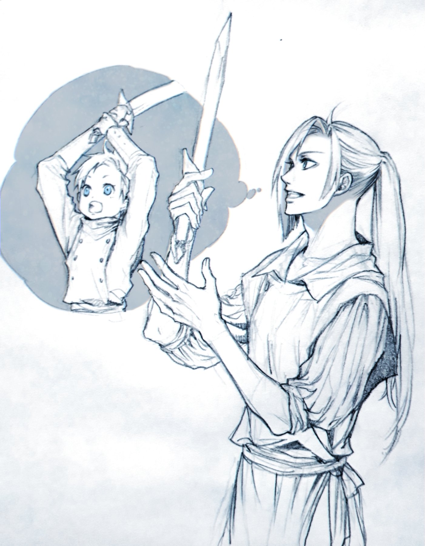 1boy age_comparison arms_up arthur_beresford asymmetrical_hair blue_eyes buttons child csanaca double-breasted hands_up higeki_no_genkyou_tonaru_saikyou_gedou_last_boss_joou_wa_tami_no_tame_ni_tsukushimasu high_ponytail highres holding holding_sword holding_weapon long_hair long_sleeves male_focus monochrome ponytail remembering sash short_sleeves simple_background smile solo speech_bubble spot_color sword thought_bubble tunic twitter_username two-handed upper_body weapon