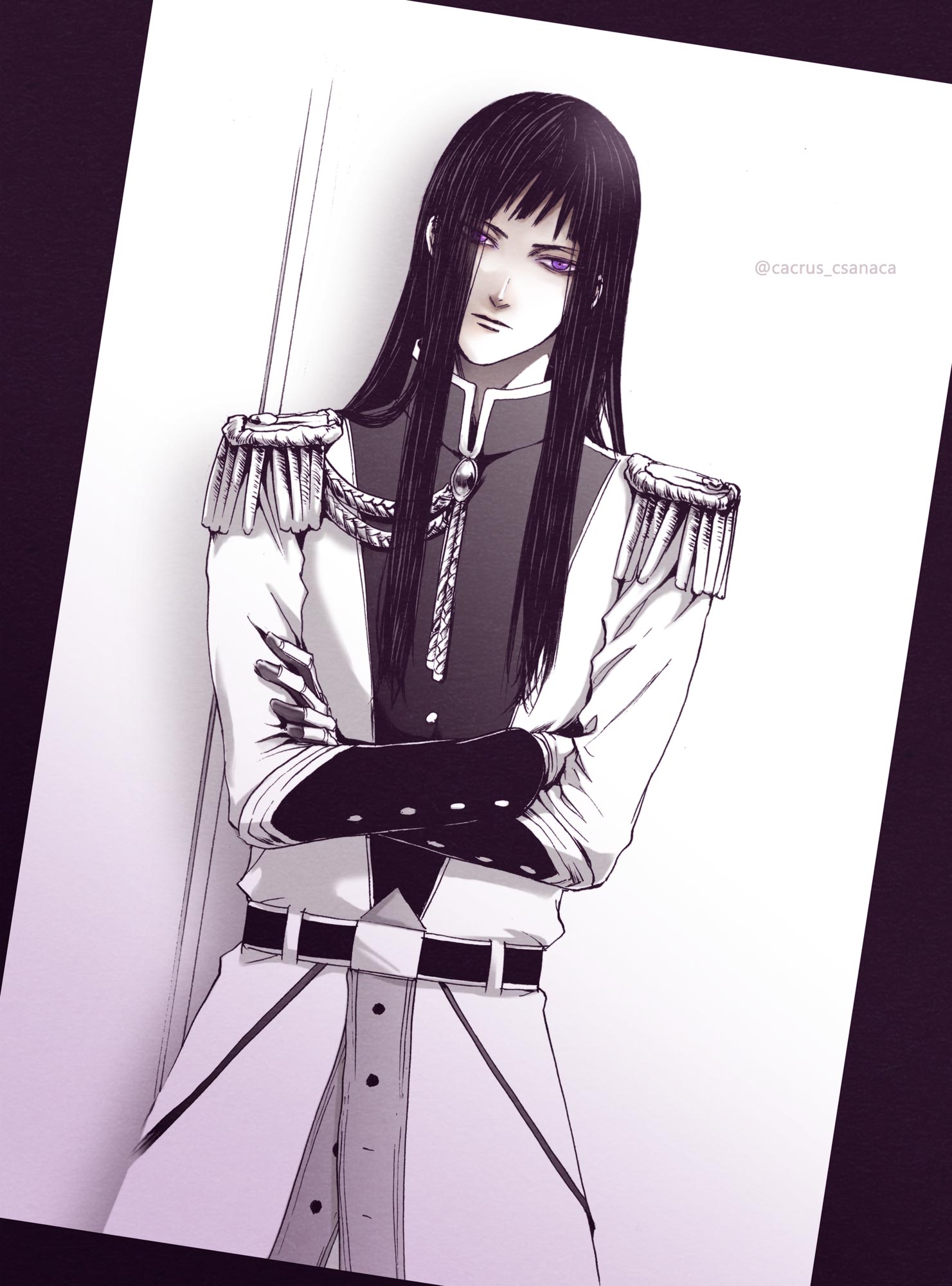 1boy aiguillette arm_guards belt brooch closed_mouth coat cowboy_shot crossed_arms csanaca dutch_angle epaulettes harrison_dirk higeki_no_genkyou_tonaru_saikyou_gedou_last_boss_joou_wa_tami_no_tame_ni_tsukushimasu highres jewelry long_hair long_sleeves looking_at_viewer male_focus military military_uniform purple_eyes simple_background solo spot_color straight_hair twitter_username white_background