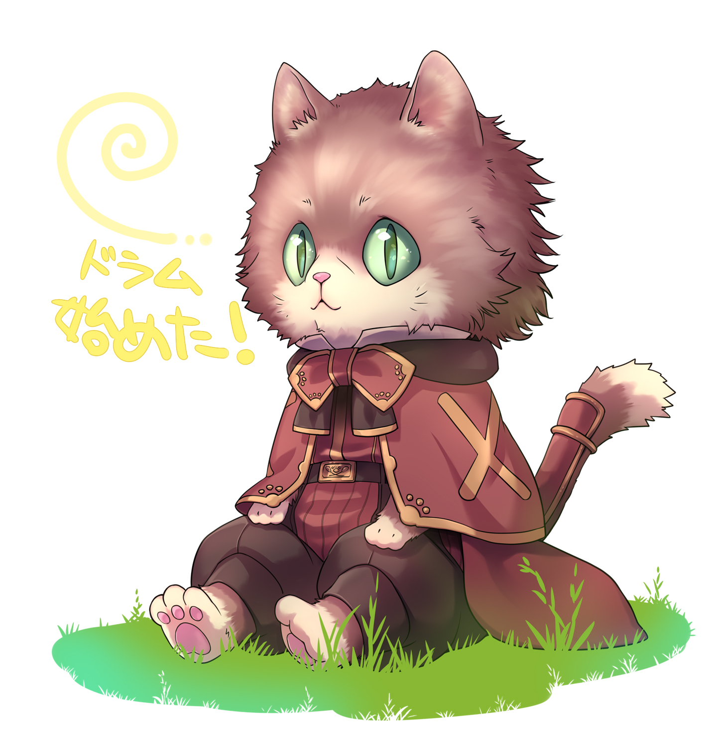 1boy barefoot belt brown_belt brown_capelet brown_coat brown_pants capelet cat_boy closed_mouth coat commentary_request fluffy full_body furry furry_male grass highres kawagoe_pochi looking_at_viewer male_focus pants ragnarok_online sitting solo summoner_(ragnarok_online) white_background