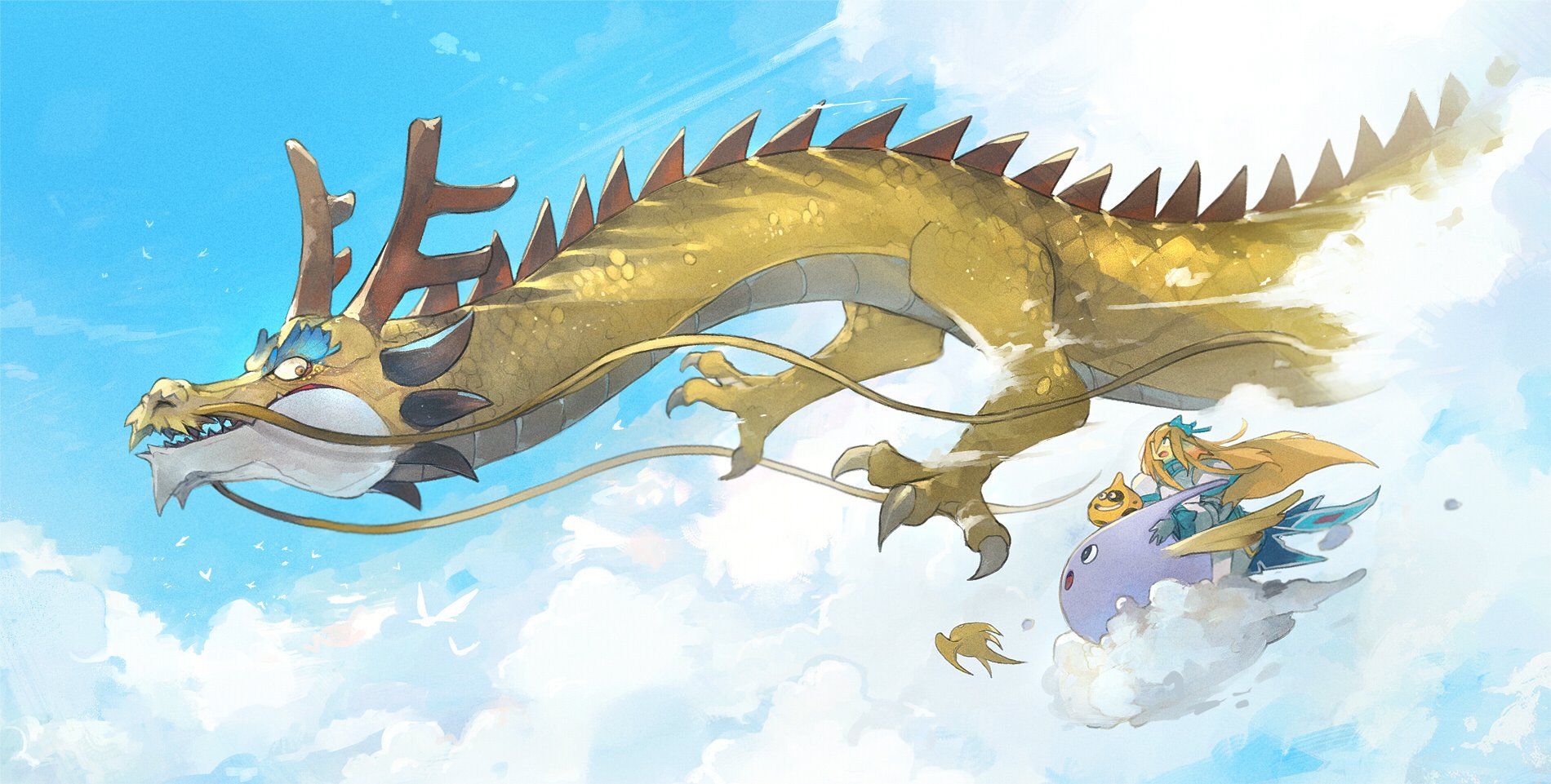 1girl above_clouds animal_focus antlers armor blonde_hair blue_bow blue_cape blue_sky bow cape claws cloud colored_eyelashes day dragon dragon_quest escalin_(hld_doreko) ethereal_serpent eye_contact flying from_side hair_bow happy highres horns linne_(hld_doreko) long_hair looking_at_another looking_back midair open_mouth outdoors profile riding sharp_teeth shoulder_armor sidelocks sideways_mouth sky slime_(creature) slime_(dragon_quest) smile spikes teeth waist_cape whiskers yellow_eyes