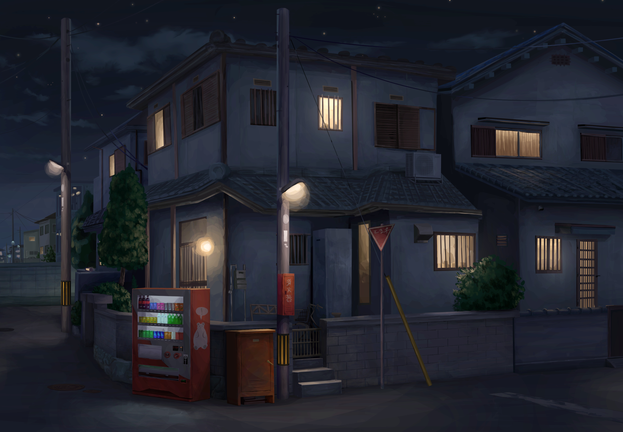 air_conditioner building cloud commentary_request highres house lamppost light night no_humans original postbox_(outgoing_mail) power_lines road road_sign scenery sign sky stop_sign street tamikko utility_pole vending_machine window