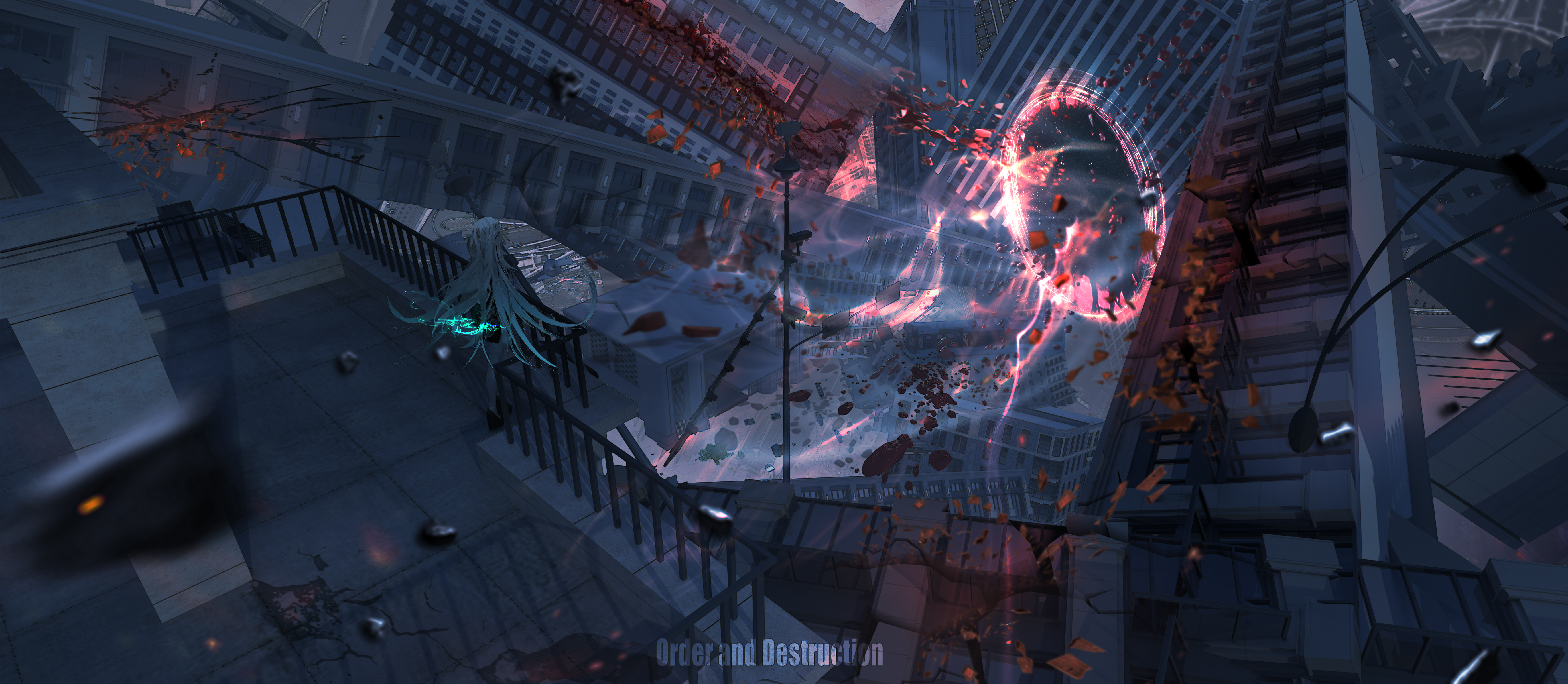 1girl absurdres apocalypse blue_eyes building chinese_commentary commentary_request english_text full_body highres lifeline_(a384079959) long_hair original outdoors portal_(object) railing rubble scenery skyscraper solo utility_pole very_long_hair wide_shot
