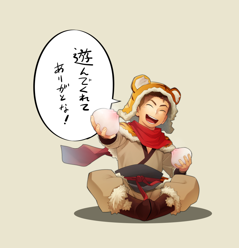 1boy animal_print baggy_clothes baggy_pants steamed_bun belt blush boots brown_hair cape capelet child closed_eyes food hat itto_(mentaiko) japanese_clothes japanese_text kimono male_focus open_mouth pants sangokushi_puzzle_taisen sitting skirt smile solo speech_bubble spiked_hair sun_quan sun_quan_(sangokushi_taisen) teeth tiger_print tongue yukata