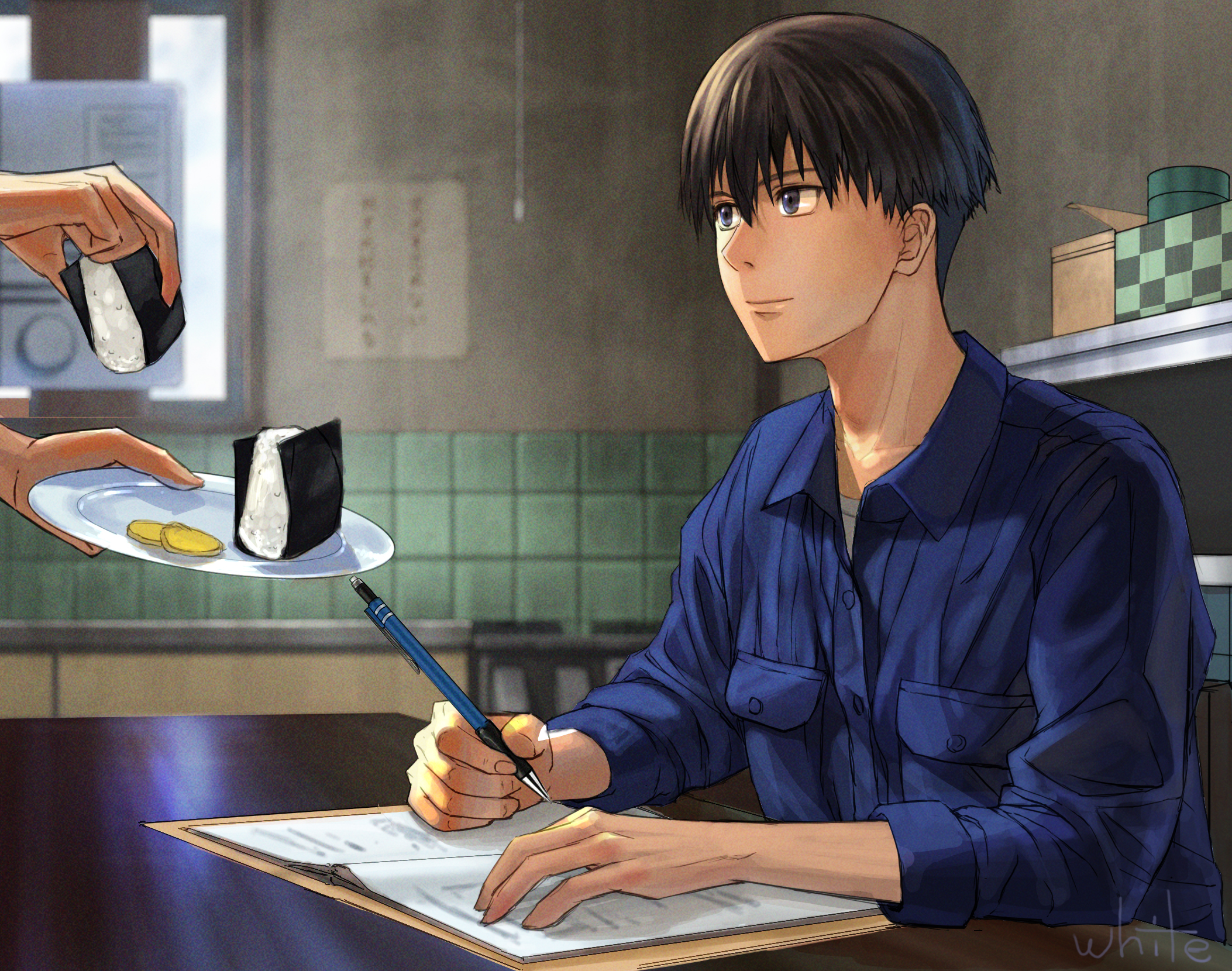 2boys artist_name black_eyes black_hair blue_shirt book food haiji_kiyose highres indoors kaze_ga_tsuyoku_fuiteiru kurahara_kakeru looking_to_the_side multiple_boys onigiri open_book pen plate shirt table white50080909