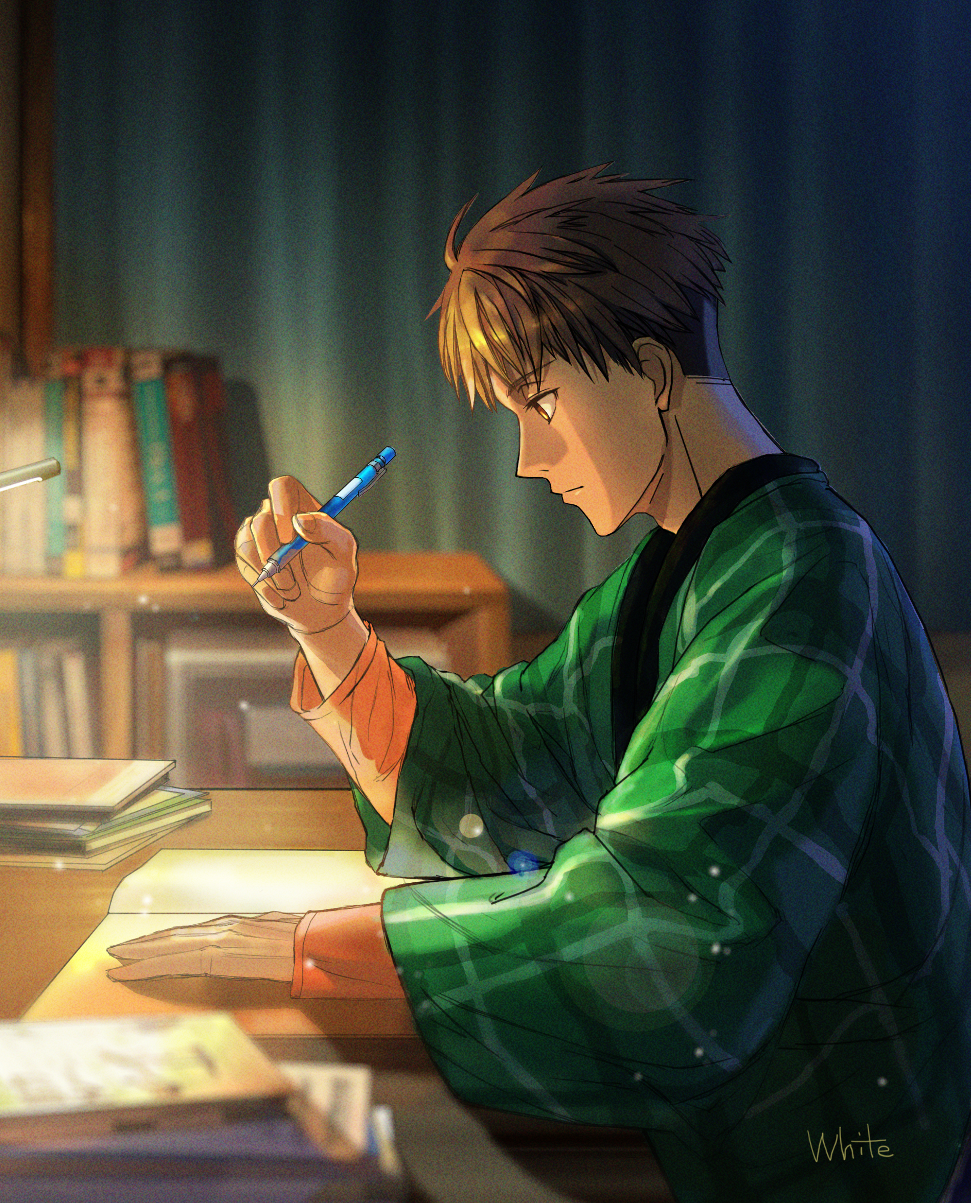 1boy artist_name blurry blurry_background book book_stack bookshelf brown_eyes brown_hair desk_lamp haiji_kiyose highres holding holding_pen indoors kaze_ga_tsuyoku_fuiteiru lamp long_sleeves male_focus mechanical_pencil pen pencil plaid slice_of_life solo studying table white50080909