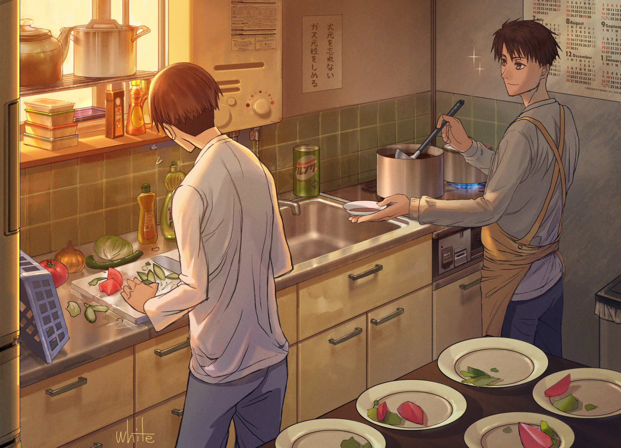 2boys apron artist_name basket black_hair brown_eyes brown_hair calendar_(object) cooking cooking_oil cooking_pot cucumber cutting_board drawer haiji_kiyose highres indoors kaze_ga_tsuyoku_fuiteiru kettle knife kurahara_kakeru ladle male_focus multiple_boys onion pants plate shirt sink slice_of_life sparkle standing stove table tomato trash_can white50080909 white_shirt