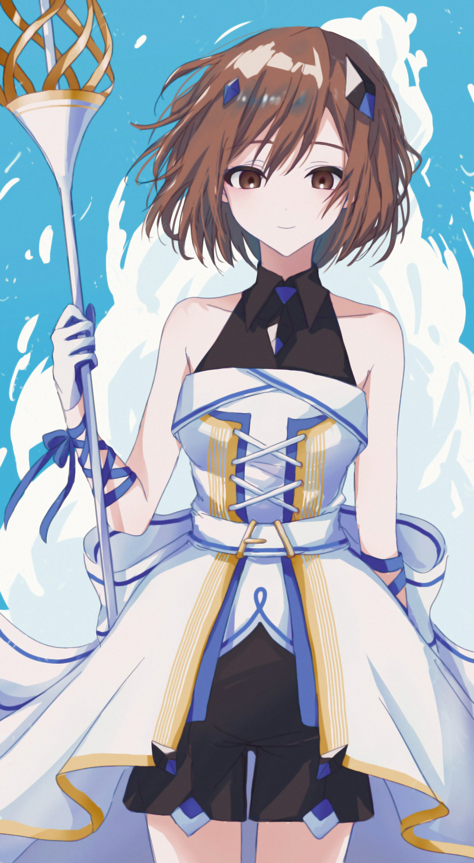 1girl brown_eyes brown_hair dress hair_ornament highres holding holding_scepter meiko_(vocaloid) meikopia outdoors peng_vmd ribbon scepter short_hair shorts sky sleeveless solo standing vocaloid white_dress