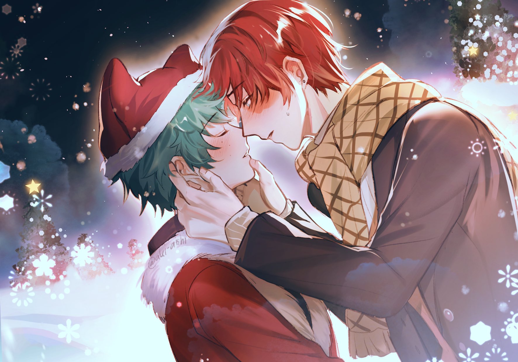 2boys akira_aishi black_jacket blush boku_no_hero_academia burn_scar christmas closed_eyes coat commentary commentary_request couple earrings english_commentary face-to-face freckles fur-trimmed_coat fur-trimmed_headwear fur_trim green_hair hands_on_another's_face hat highres imminent_kiss jacket jewelry long_sleeves male_focus midoriya_izuku mixed-language_commentary multiple_boys open_clothes open_jacket parted_lips red_coat red_hair red_headwear santa_costume santa_hat scar scar_on_face scarf short_hair snowflakes star_(symbol) thai_commentary todoroki_shoto tree white_hair yaoi yellow_scarf