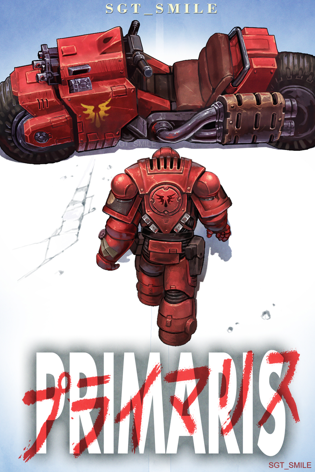 1boy adeptus_astartes akira_(manga) akira_movie_poster armor artist_name commentary english_commentary from_above from_behind highres imperium_of_man logo_parody motor_vehicle motorcycle parody power_armor primaris_space_marine red_armor sgt_lonely solo title_parody walking warhammer_40k