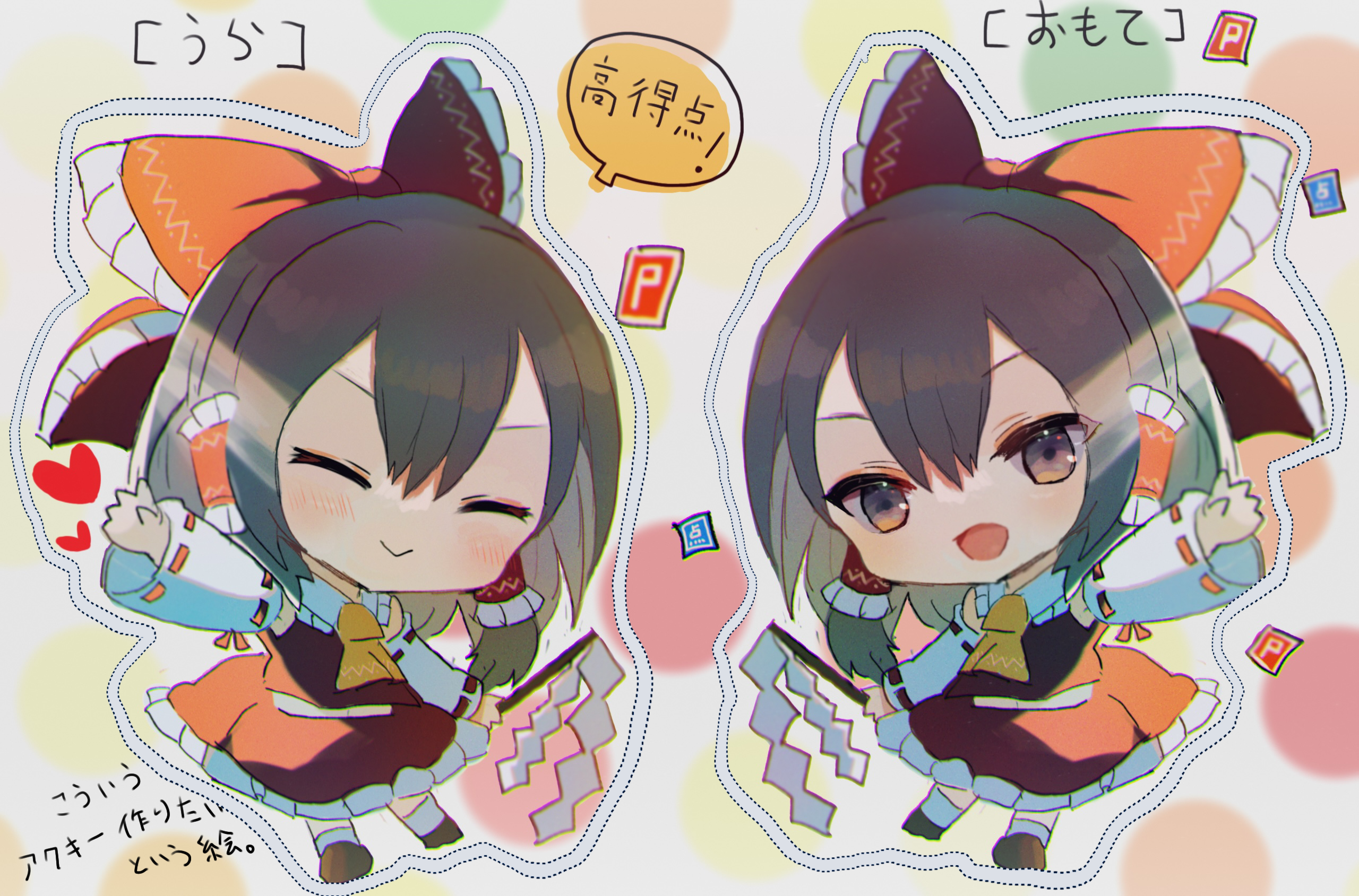 ascot bow brown_eyes brown_footwear brown_hair chibi collar detached_sleeves dual_persona closed_eyes hair_bow hair_tubes hakurei_reimu highres ke-a-ru nontraditional_miko red_bow red_shirt red_skirt ribbon-trimmed_sleeves ribbon_trim shirt short_hair sidelocks skirt skirt_set sleeveless smile touhou white_collar white_legwear yellow_ascot