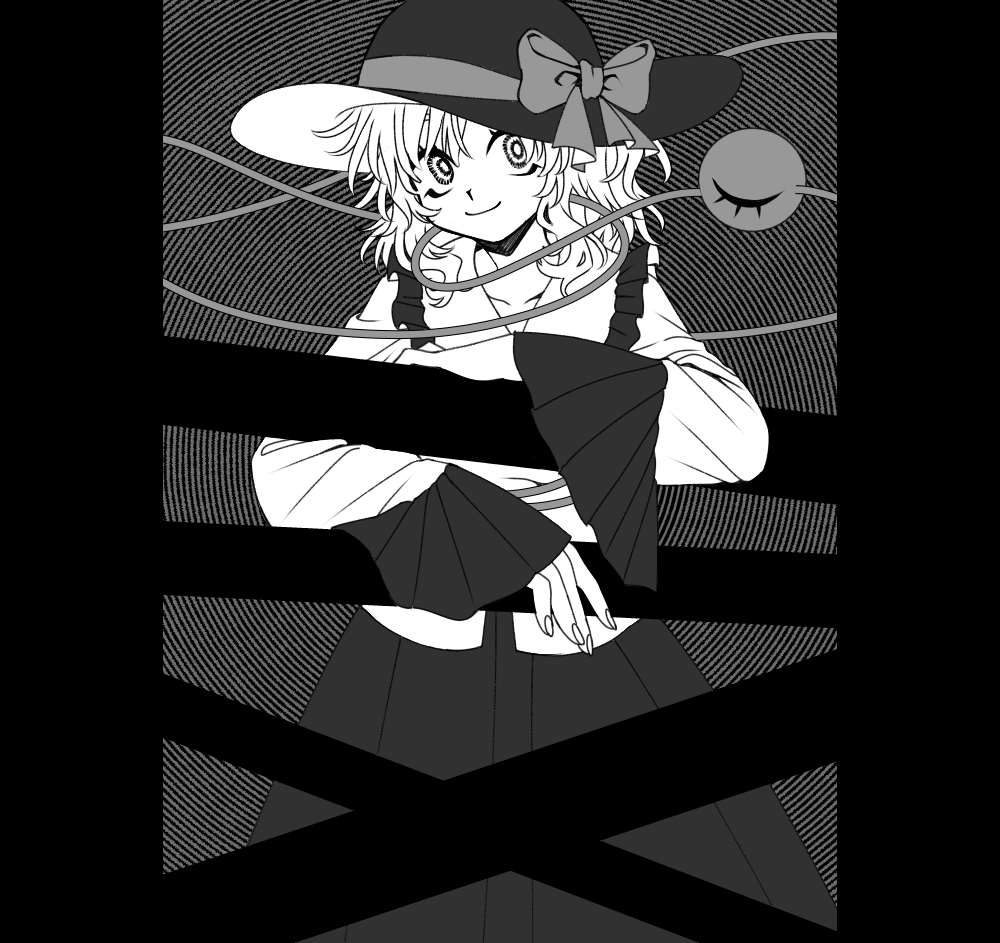1girl bad_id bad_pixiv_id blouse bow closed_mouth collarbone cowboy_shot frilled_shirt_collar frilled_sleeves frills greyscale hair_between_eyes hat hat_bow head_tilt inactive_account komeiji_koishi long_sleeves looking_at_viewer medium_hair monochrome safe3133 shirt skirt smile solo untranslatable_commentary third_eye touhou wide_sleeves
