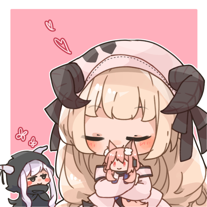 2girls animal_ear_fluff arknights black_cloak blush character_doll cloak closed_eyes closed_mouth commentary_request doll heart hood hood_down hooded_cloak horns horns_through_headwear hugging_object light_brown_hair long_hair midzuchi multiple_girls nearl_(arknights) nearl_the_radiant_knight_(arknights) nightingale_(arknights) pink_background shining_(arknights) smile two-tone_background very_long_hair white_background
