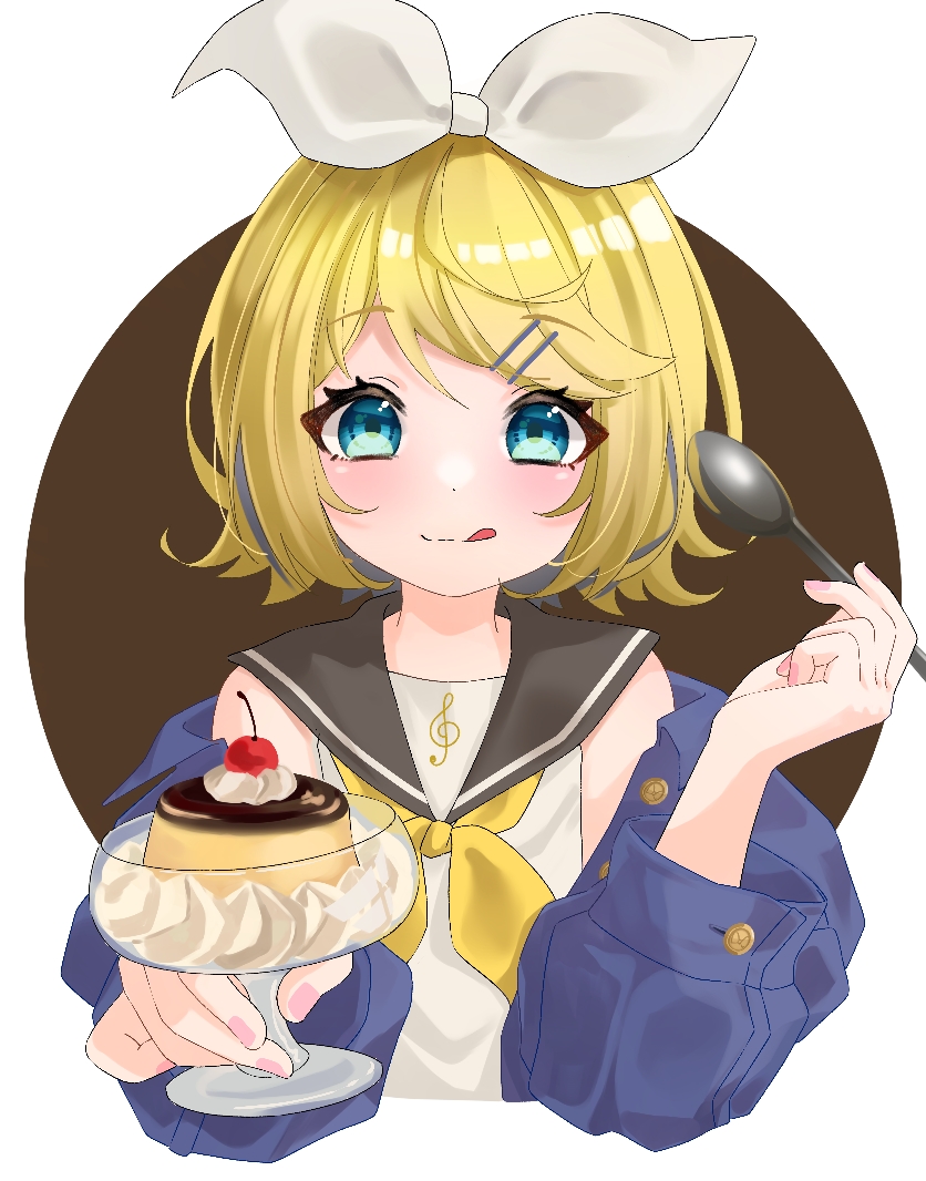 1girl :p blonde_hair blue_eyes blush bow cherry cropped_torso flipped_hair food fruit gumi_lilk hair_bow hair_ornament hairclip holding holding_food holding_spoon jacket kagamine_rin licking_lips looking_at_object multicolored_hair neckerchief off_shoulder pudding pudding_a_la_mode school_uniform serafuku shirt short_hair sleeveless sleeveless_shirt smile solo spoon streaked_hair tongue tongue_out vocaloid