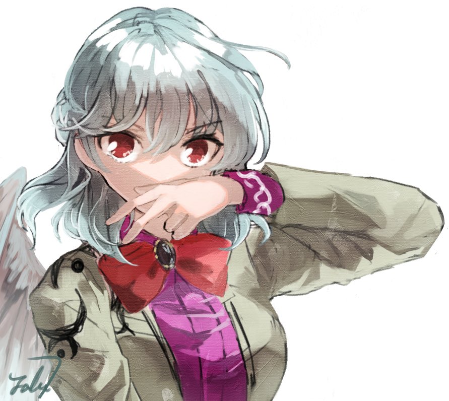 1girl bow bowtie braid breasts brooch commentary covered_mouth grey_hair grey_jacket hair_between_eyes hand_to_own_mouth jacket jewelry kishin_sagume large_breasts looking_at_viewer medium_hair nanataru10 one-hour_drawing_challenge open_clothes open_jacket purple_shirt red_eyes shirt signature single_wing solo touhou upper_body white_background white_wings wings