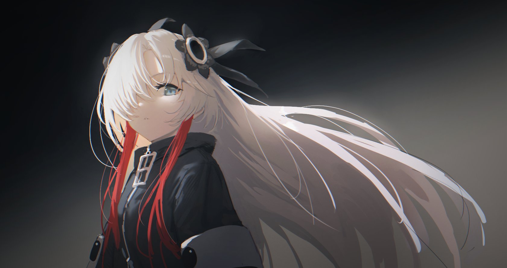 1girl black_flower blue_eyes flower hair_flower hair_ornament hair_over_one_eye hara_shoutarou highres isekaijoucho kamitsubaki_studio long_hair multicolored_hair oversized_zipper parted_lips red_hair solo upper_body virtual_youtuber white_hair zipper zipper_pull_tab