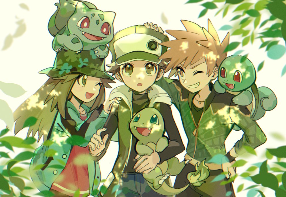 1girl 2boys ;d alternate_color black_shirt blue_oak blue_oak_(sygna_suit) brown_eyes brown_hair bulbasaur buttons charmander chinese_commentary coat commentary_request eyelashes gen_1_pokemon green_theme grin hair_flaps hand_on_own_hip hat holding holding_pokemon huan_li jacket jewelry leaf_(pokemon) leaf_(sygna_suit)_(pokemon) long_hair multiple_boys necklace nintendo official_alternate_costume on_head one_eye_closed open_mouth pants pokemon pokemon_(creature) pokemon_masters_ex pokemon_on_head red_(pokemon) red_(sygna_suit)_(pokemon) shirt sleeveless sleeveless_coat smile squirtle teeth tongue zipper_pull_tab