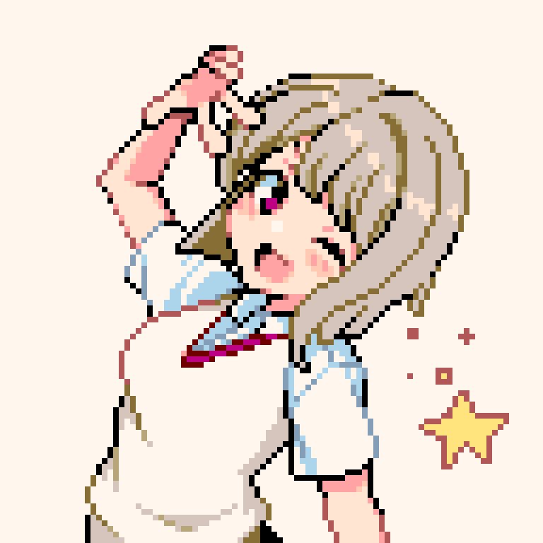 blush_stickers commentary hand_up light_brown_background light_brown_hair love_live! love_live!_nijigasaki_high_school_idol_club nakasu_kasumi o_12_9 one_eye_closed open_mouth pink_eyes pixel_art shirt short_hair short_sleeves smile solo sparkle star_(symbol) v vest white_shirt white_vest wing_collar