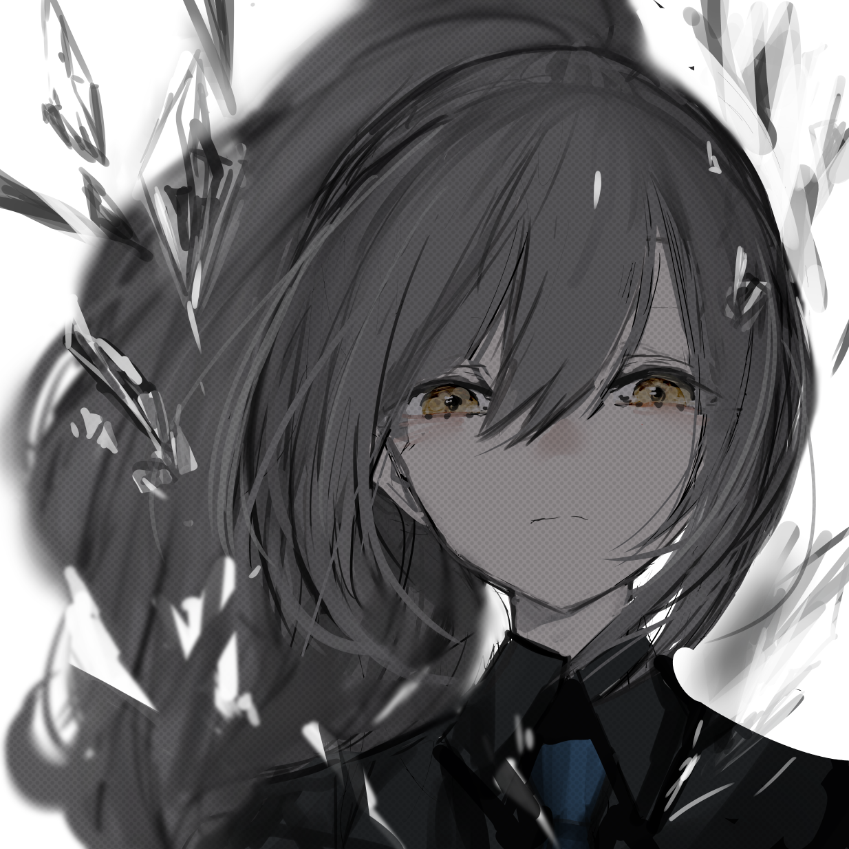 1girl black_shirt blue_necktie closed_mouth collared_shirt highres long_hair looking_at_viewer narue necktie original ponytail portrait shirt solo wing_collar yellow_eyes
