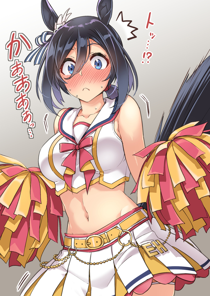 1girl :< ^^^ abo_(hechouchou) animal_ears black_hair blue_eyes blush cheerleader commentary_request cosplay cowboy_shot eishin_flash_(umamusume) grey_background hair_between_eyes horse_ears horse_girl looking_at_viewer low_ponytail navel nice_nature_(run&win)_(umamusume) nice_nature_(umamusume) nice_nature_(umamusume)_(cosplay) nose_blush pleated_skirt pom_pom_(cheerleading) ponytail skirt solo stomach tail_raised umamusume