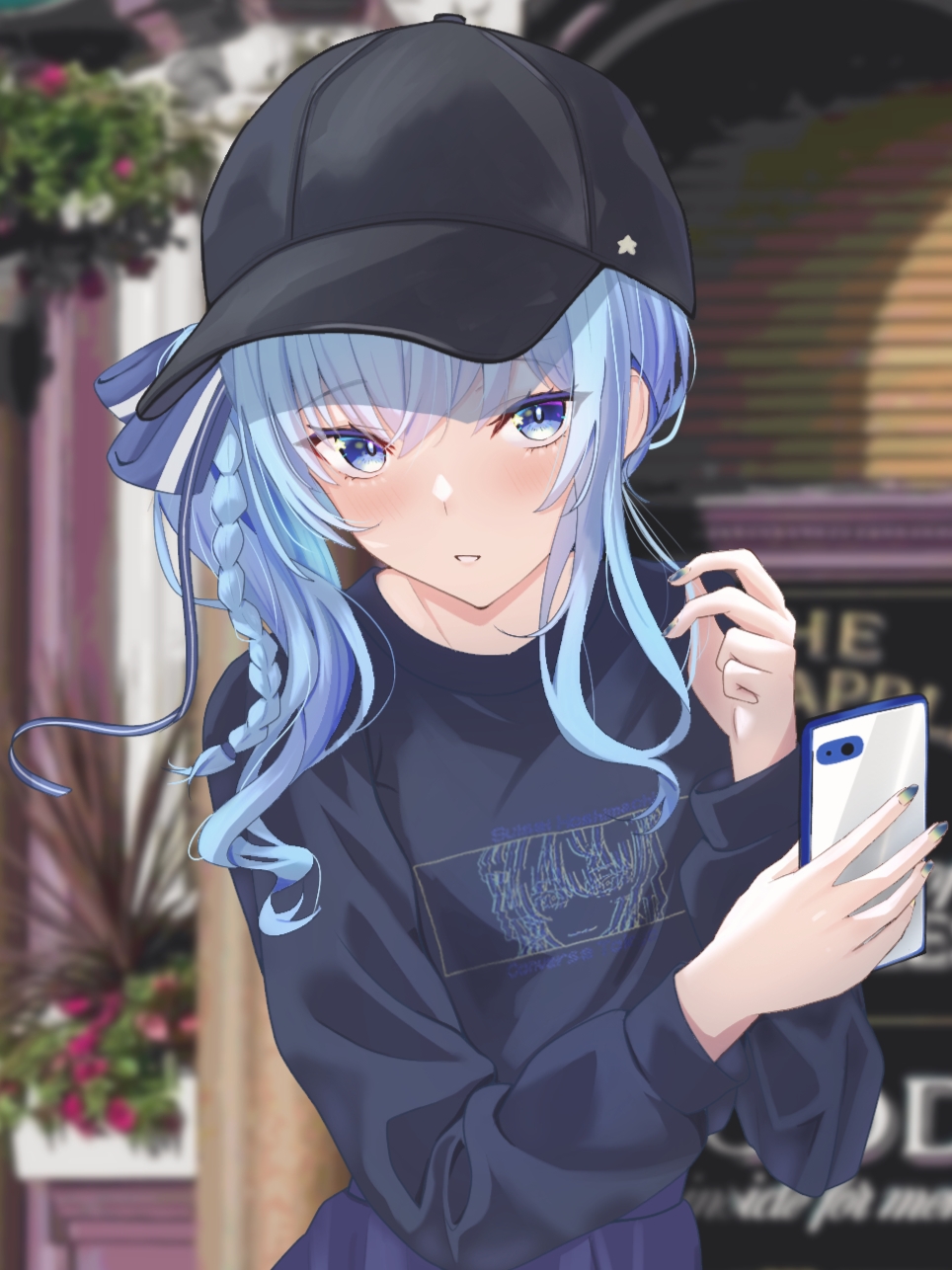 1girl baseball_cap black_hat black_shirt blue_bow blue_eyes blue_hair blue_nails blurry blurry_background blush bow braid cellphone day hair_between_eyes hair_bow hat highres holding holding_phone hololive hoshimachi_suisei long_hair long_sleeves looking_at_viewer nail_polish oniku_(o29sukizero) outdoors parted_lips phone print_shirt shirt single_braid smartphone solo upper_body virtual_youtuber