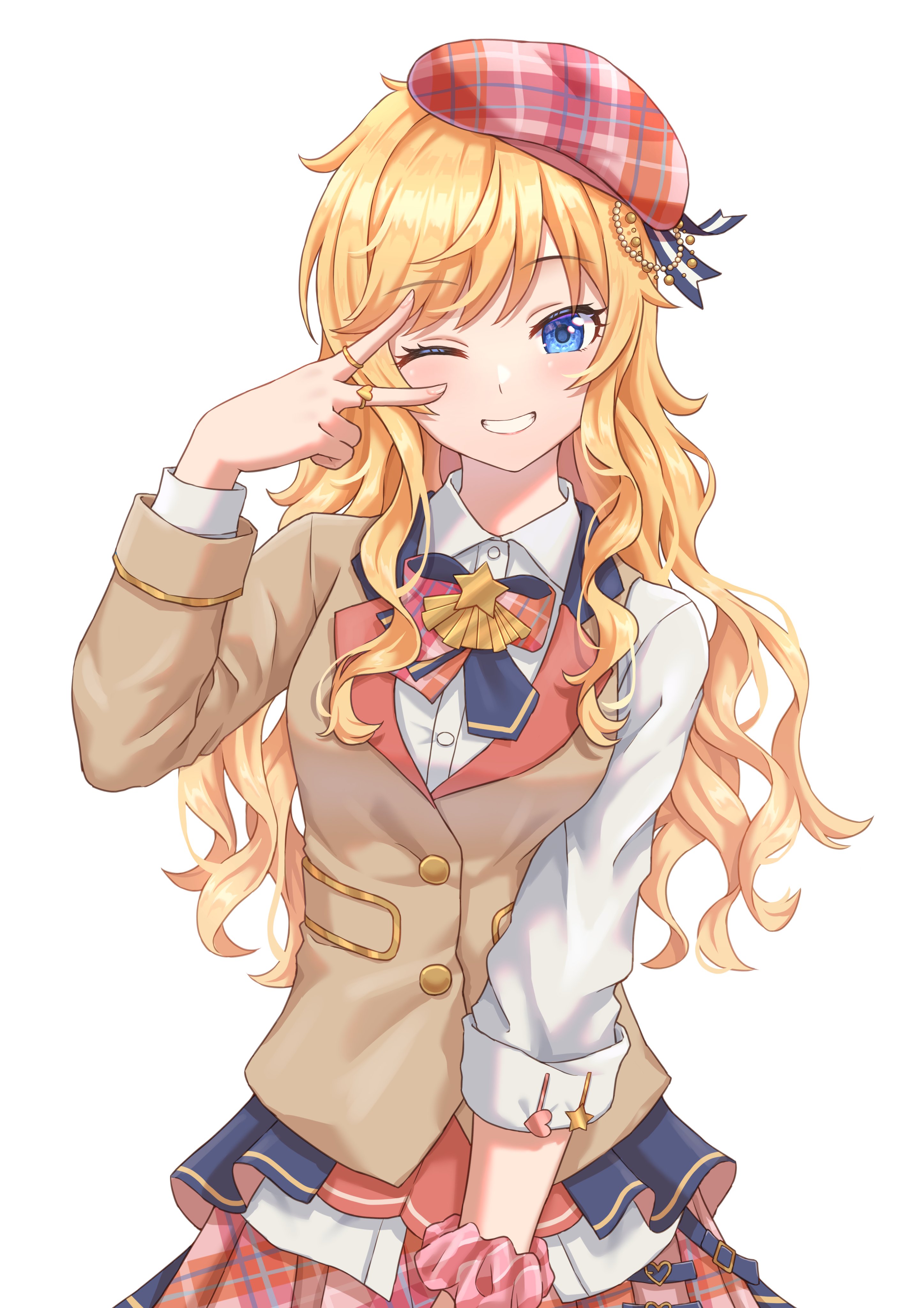 1girl ;d absurdres aqua_eyes asymmetrical_clothes beret blazer blonde_hair bow bowtie brown_jacket dress grin hat highres idol idolmaster idolmaster_cinderella_girls jacket jewelry long_hair looking_at_viewer ohtsuki_yui one_eye_closed open_mouth plaid_clothes plaid_headwear plaid_skirt pleated_dress ring scrunchie simoumi_217 simple_background single_sleeve skirt smile solo v wavy_hair white_background wrist_scrunchie