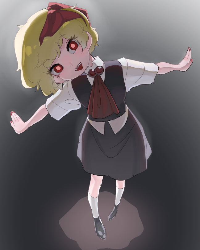1girl ascot black_footwear black_skirt black_vest blonde_hair blouse bow collared_shirt frogsnake full_body hair_bow head_tilt kneehighs looking_at_viewer nail_polish open_mouth red_eyes red_nails rumia sharp_teeth shirt short_hair short_sleeves skirt socks solo standing t-pose teeth touhou vest waistcoat white-framed_eyewear white_shirt