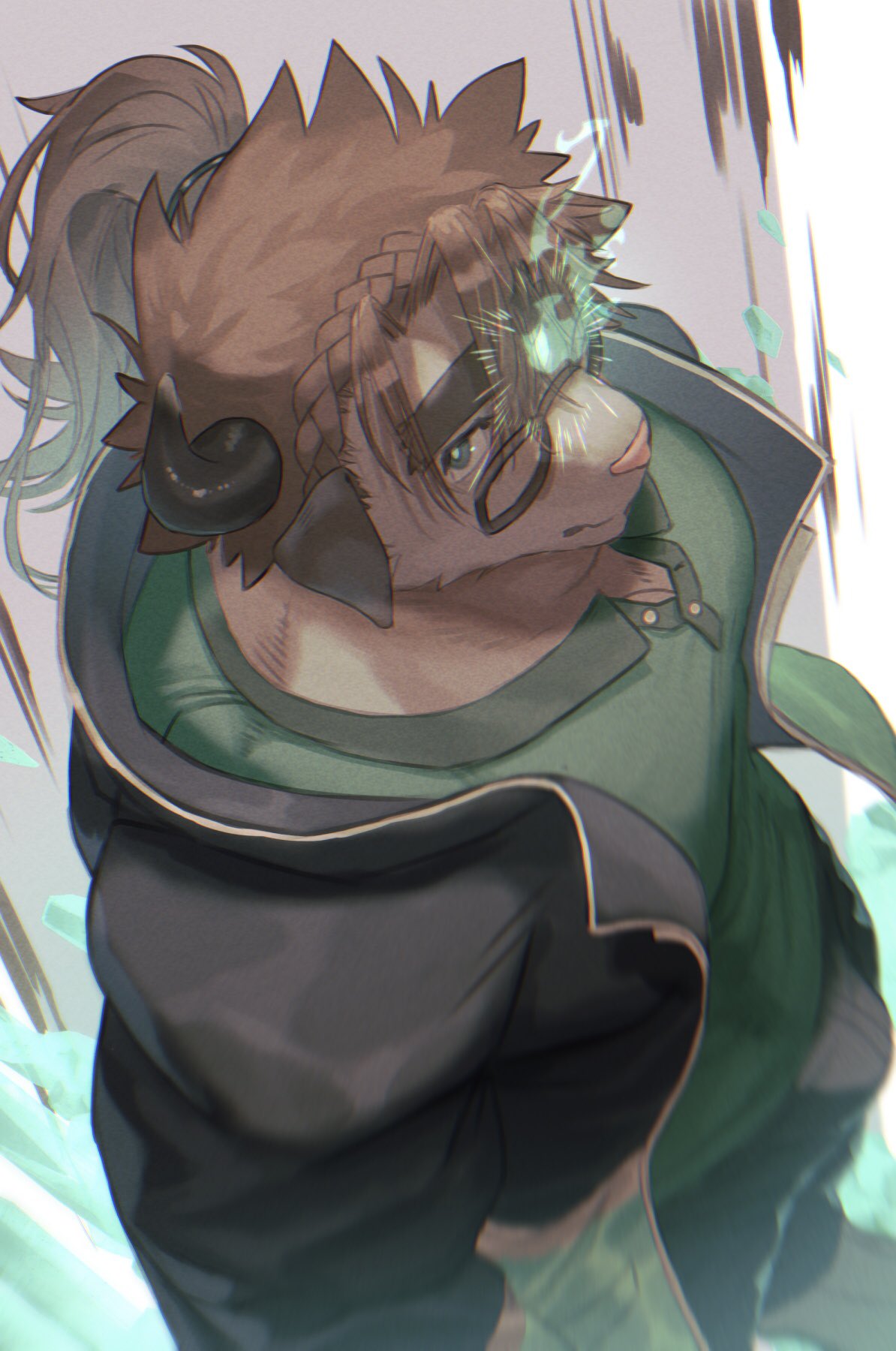 1boy animal_ears bara birry black_jacket braid brown_hair catoblepas_(housamo) crown_braid from_above furry furry_male glasses glowing glowing_eye green_jacket green_shirt highres horns jacket long_hair looking_at_viewer male_focus multicolored_jacket muscular muscular_male ponytail shirt simple_background snout solo thick_eyebrows tokyo_houkago_summoners two-tone_jacket upper_body