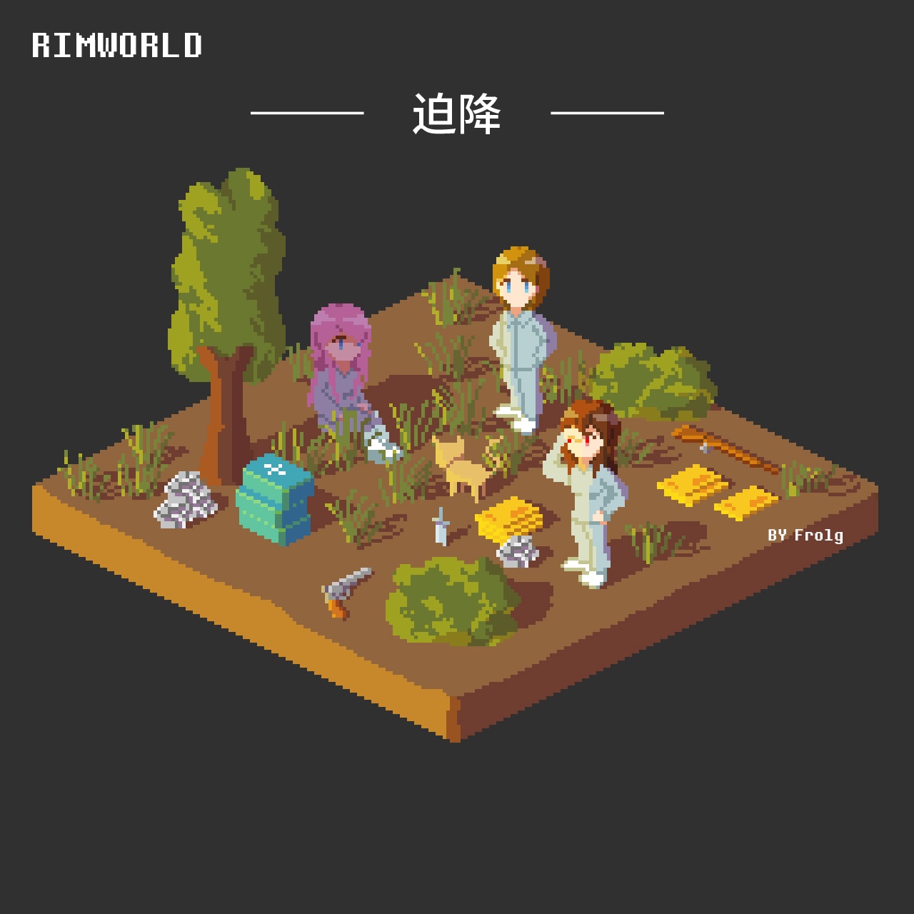 1boy 2girls artist_name blouse blue_eyes blue_pants blue_shirt bush cat chinese_text commentary english_text field_ration first_aid_kit frolg grass gun handgun highres isometric knife long_hair long_sleeves mixed-language_commentary field_ration multiple_girls outdoors pants pink_hair pixel_art red_eyes revolver rifle rimworld shirt short_hair sitting tree weapon