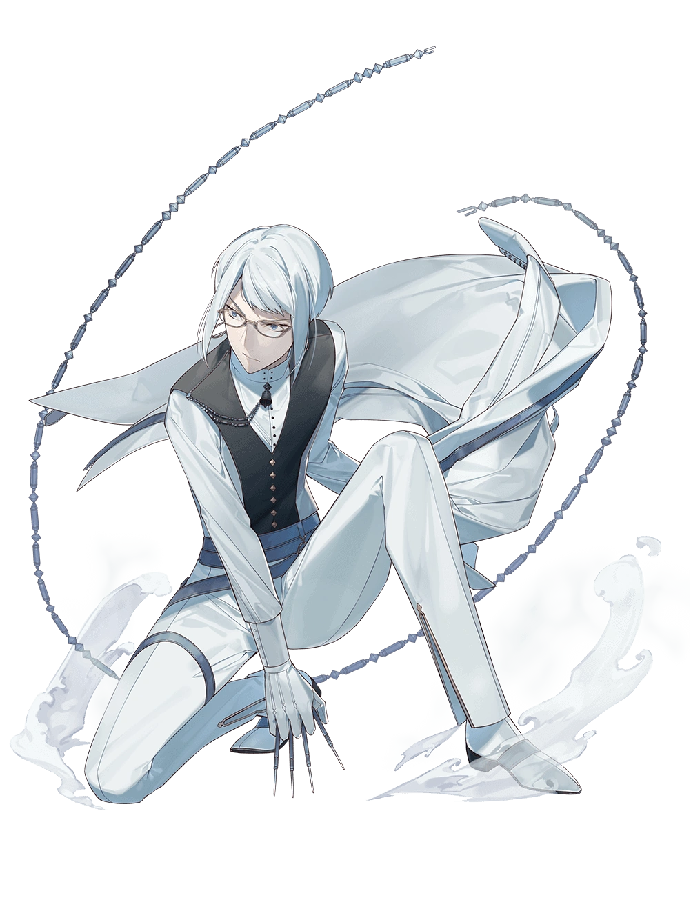 1boy bell belt between_fingers black_vest blouse blue_eyes buttons chain closed_mouth coat coattails diamond_button dress_shirt dust_cloud eyewear_strap food_fantasy full_body glasses gloves grey_belt highres holding holding_coat holding_knife holding_unworn_clothes holster knife knives_between_fingers looking_to_the_side male_focus mandarin_collar muenchner_weisswurst_(food_fantasy) official_art on_one_knee pants rezia scalpel serious shirt short_hair_with_long_locks solo tailcoat thigh_holster third-party_source transparent_background unworn_coat v-shaped_eyebrows vest white_coat white_footwear white_gloves white_hair white_pants white_shirt