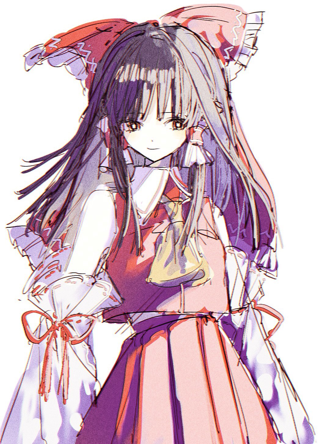 1girl arms_at_sides ascot blunt_bangs blush bow brown_hair closed_mouth detached_sleeves frilled_bow frilled_hair_tubes frills hair_bow hair_tubes hakama hakurei_reimu highres japanese_clothes koyomiyoko_o long_hair looking_at_viewer orange_eyes red_bow red_hakama red_ribbon red_vest ribbon ribbon-trimmed_sleeves ribbon_trim sidelocks simple_background smile solo touhou upper_body vest white_background white_sleeves yellow_ascot