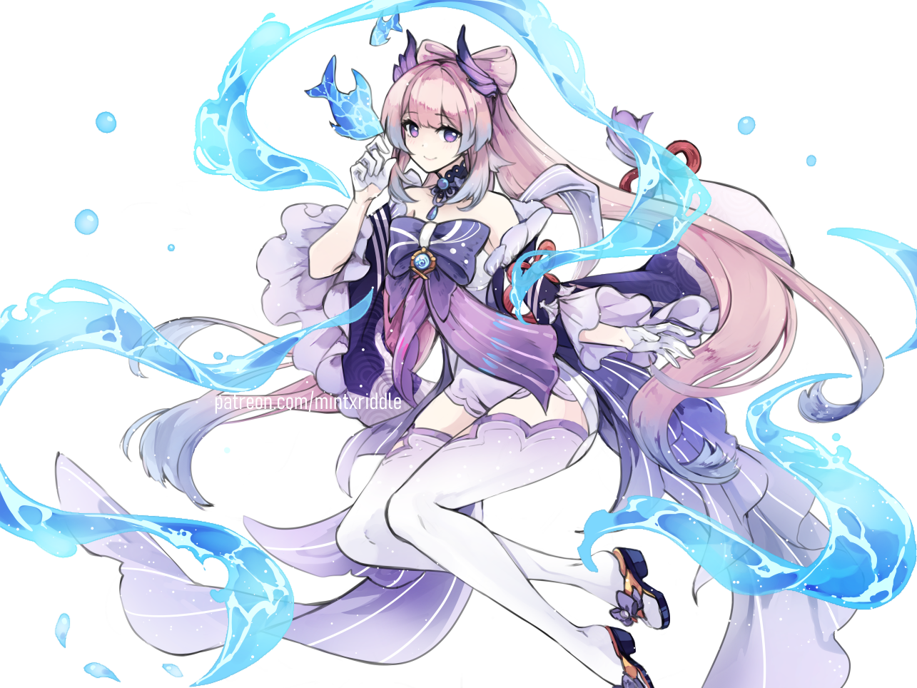 1girl bare_shoulders blue_bow blunt_bangs bow closed_mouth detached_sleeves fish floating frilled_sleeves frills full_body genshin_impact gloves gradient_hair hair_ornament large_bow long_hair long_sleeves looking_at_viewer mintxriddle multicolored_hair patreon_username pink_hair purple_eyes sandals sangonomiya_kokomi simple_background smile solo thighhighs very_long_hair vision_(genshin_impact) water white_background white_gloves white_thighhighs