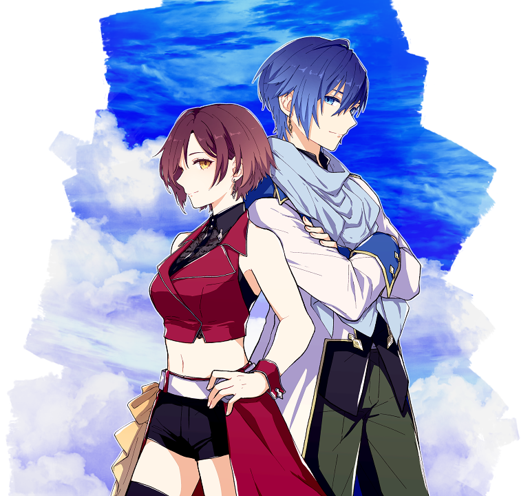 1boy 1girl back-to-back blue_eyes blue_hair brown_eyes brown_hair coat crossed_arms hands_on_own_hips kaito_(vocaloid) long_sleeves looking_at_another meiko_(vocaloid) midriff scarf short_hair sky sleeveless smile vocaloid xxxxxxxxxlr