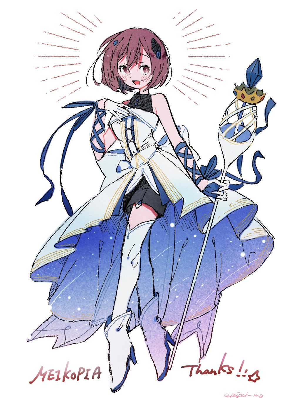 1girl alternate_costume boots brown_eyes brown_hair dress hazime high_heel_boots high_heels highres holding holding_scepter holding_staff meiko_(vocaloid) meikopia ribbon scepter short_hair shorts simple_background smile solo staff thighhighs vocaloid white_boots white_thighhighs