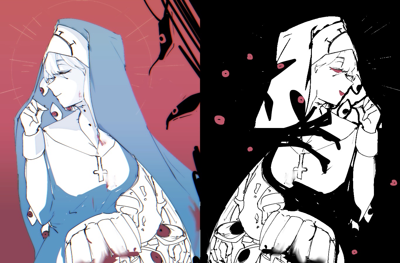 1girl black_background blue_background closed_eyes contrast cross cross_necklace double_(skullgirls) extra_eyes jewelry multiple_views necklace nun open_mouth red_background red_eyes renka_(renxka) skullgirls smile spot_color upper_body